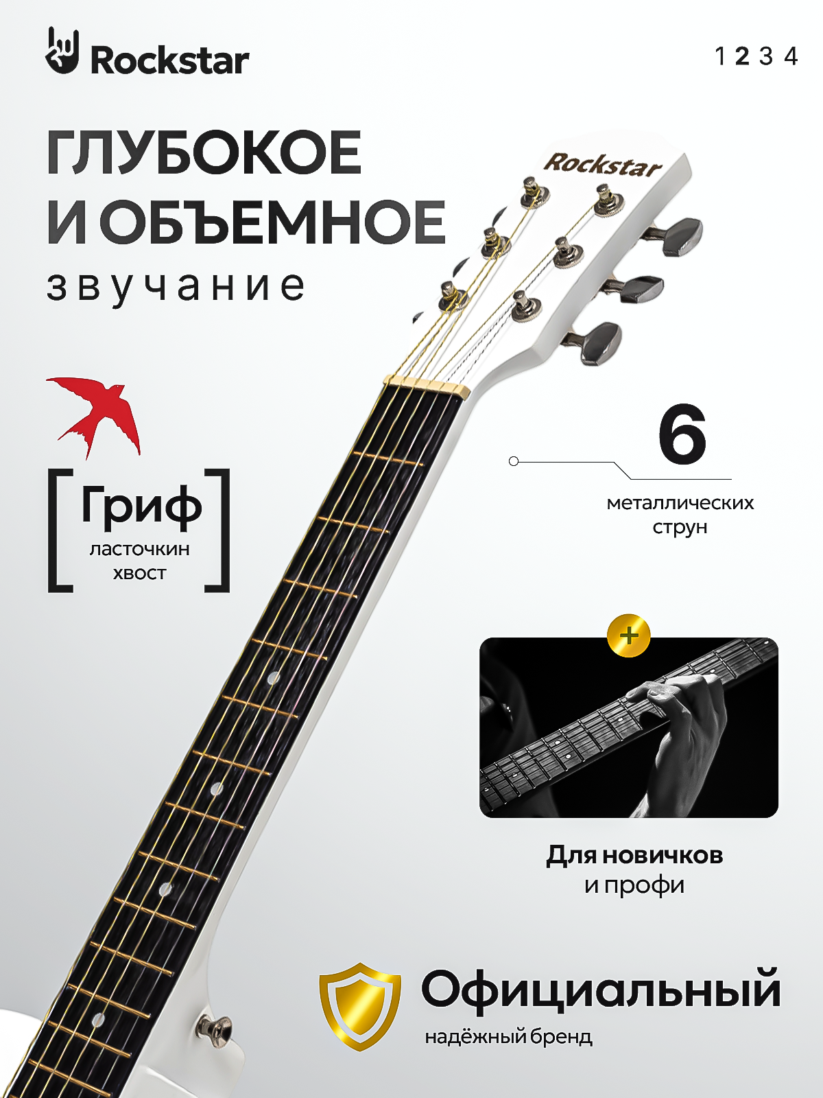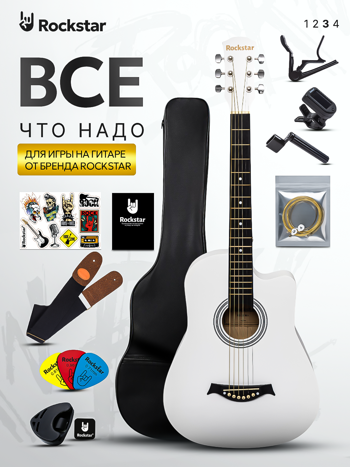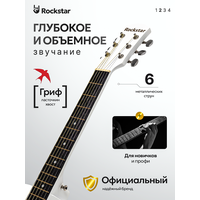 | В комплекте | Rockstar входит: 1. Гитара акустическая 38 2. Водонепроницаемый Чехол с доп. карманом 3. Ремень для гитары 4. Комплект струн для акустической гитары 5. Каподастр металлический 6. держатель для гитары 7. Комплект с 3 медиаторов 8. Запасная первая струна 9. Тюнер 10. Руководство по настройке гитары |