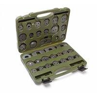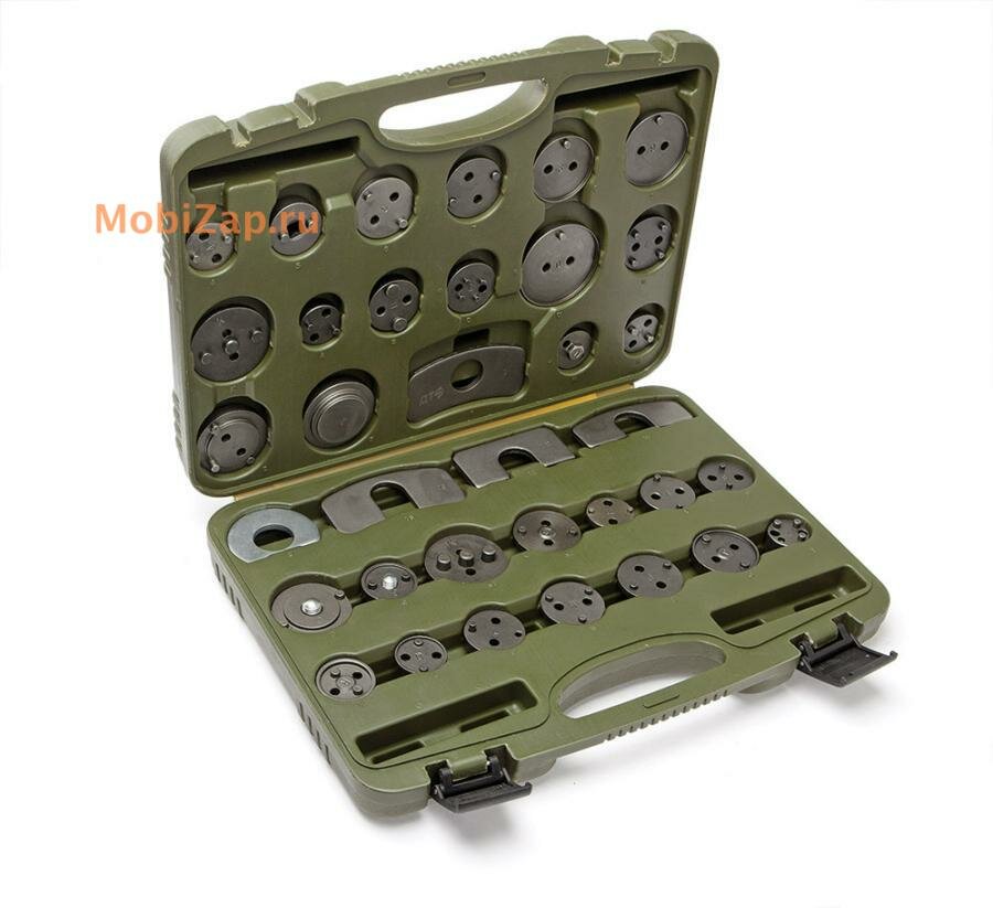 Состав набора: — насадки — 28 шт. — планки-упоры — 5 шт. — насадка для утапливания поршней без вращения — насадка-адаптер под вороток 3/8" для совмещения пазов на поршне и тормозных накладках — пластиковый кейс