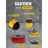 Набор щеток разного размера и 1 удлинитель. Набор щеток для уборки на шуруповерт предназначен для дома, офиса, авто, а именно чистки и полировки любых бытовых поверхностей, мытья раковины и ванны, для ковров и плинтуса, для душевых кабин и бассейна, для плитки, для окон. Благодаря тому, что вращающиеся насадки щетки разной формы и размеров, уборка возможна даже в труднодоступных местах. Есть даже щетка для химчистки салона автомобиля, а еще щетка для мытья окон. Щетка для уборки пыли (детейлинга). Набор для полировки автомобиля не царапает поверхность. Набор щеток для мойки поможет сделать уборку проще и сэкономит ваше время и деньги. Насадки подойдут на дрель любой фирмы. Доказанная эффективность при использовании с профессиональными чистящими средствами теперь доступна каждому. Химчистка салона авто теперь займёт совсем мало времени. Насадка на дрели используются на электроинструментах, чтобы облегчить уборку дома. Насадка на шуруповерт- отличный набор для профессионалов автохимчистки и детейлинга, щетки для химчистки, щетки для мытья ковров. Насадки для мытья автомобиля станут помощниками для чистки кафеля, керамогранита, каменных поверхностей, тканей и пола. В нашем наборе найдется щетка, (насадка на шуруповер) и для мойки окон, для уборки дома, щетка для пола, щетка для машины, щетка для мытья посуды и детейлинга авто. Главное, наши насадки на шуруповерт помогут забыть, что удаление загрязнений требует прикладывания больших усилий. Насадки для шуруповерта сменные, достаточно зафиксировать нужную насадку на инструмент и включить его. Шуруповерт В комплект НЕ входит. Щетка мытья автомобиля, дисков, фар - отличный подарок мужу, папе и другу. Комплект, насадка удлинитель и щетки для уборки на дрель шуруповерт пригодится в каждой семье!