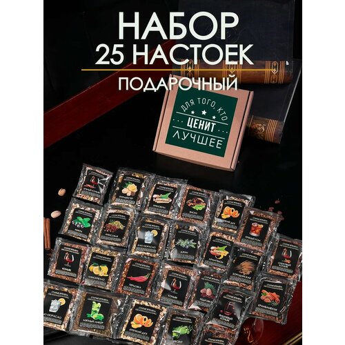 Вы ищете подарок для мужчины? Подарочный набор для приготовления настоек с разнообразными специями и традиционными рецептами- оригинальный и нужный подарок! Набор настоек для мужчин позволит экспериментировать со вкусами и создавать уникальные настойки. Алкоголь: водка или спирт в набор не входят, вы можете выбрать любую основу и каждый вкус получится особенным и ярким! Можно приготовить такие напитки как: егермейстер, джин, виски, бехеровка, лимончелло. Этот подарочный набор для мужчин никого не оставит равнодушным. В комплекте 25 пакетиков смеси для приготовления настоек для настаивания ароматных и качественных напитков в домашних условиях и подробный рецепт. Этот подарок папе также является универсальным подарком на др, новоселье, брату, дедушке, коллеге, другу, начальнику и любому мужчине, Это не простой алкогольный набор самогонщика или подарочный набор продуктов: настойки для самогона это 25 специи с авторскими заготовками - смесями из натуральных трав со всей страны для настаивания. Данный набор для настоек в фильтр-пакетах, а в нашем магазине DaroLand также имеется набор настоек со специями с бутылками. Коробочка с наполнением в виде необычных, интересных миксов для приготовления алкогольных напитков выступит стильным сувениром и превосходным презентом на 23 февраля, юбилей, день рождения, новый год, любое другое без исключения праздничное мероприятие и даже вовсе без какого-то особого повода.