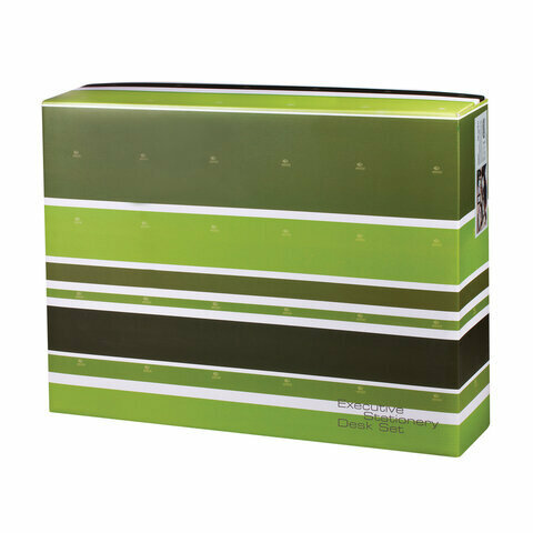 Набор состоит из 7 предметов: двойной лоток для бумаг, коврик для письма (размер – 60х42 см), подставка для ручек (2 шариковые ручки в комплекте), стакан-подставка для письменных принадлежностей, подставка для бумажного блока, нож для вскрытия конвертов, подставка для перекидного календаря. Все предметы изготовлены из дерева цвета "орех" с золотистой фурнитурой. Набор упакован в подарочную коробку, а также дополнительно в защитный гофрокорб для транспортировки.