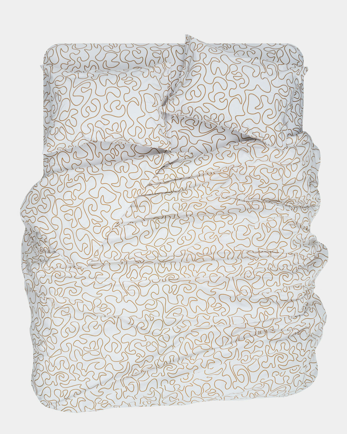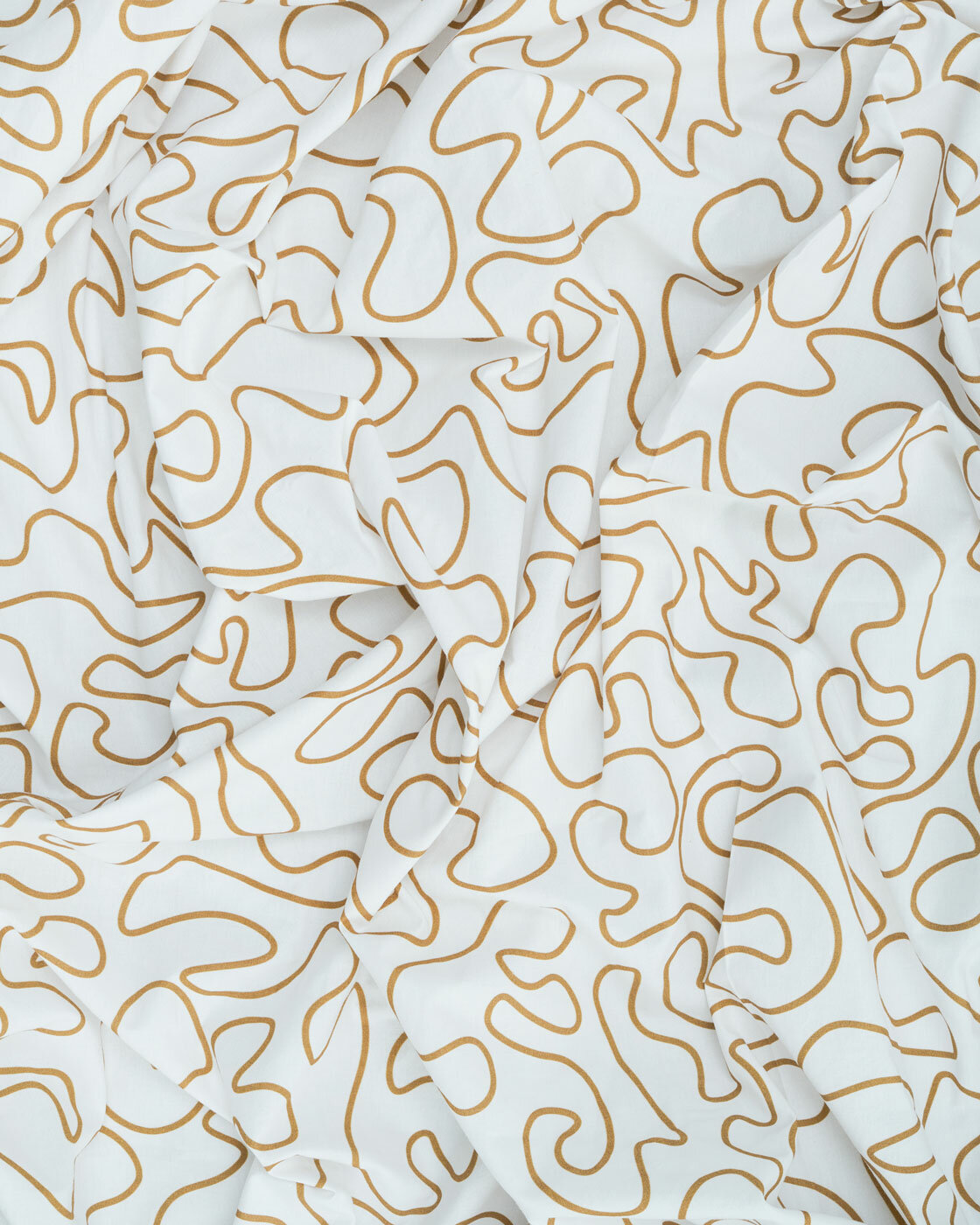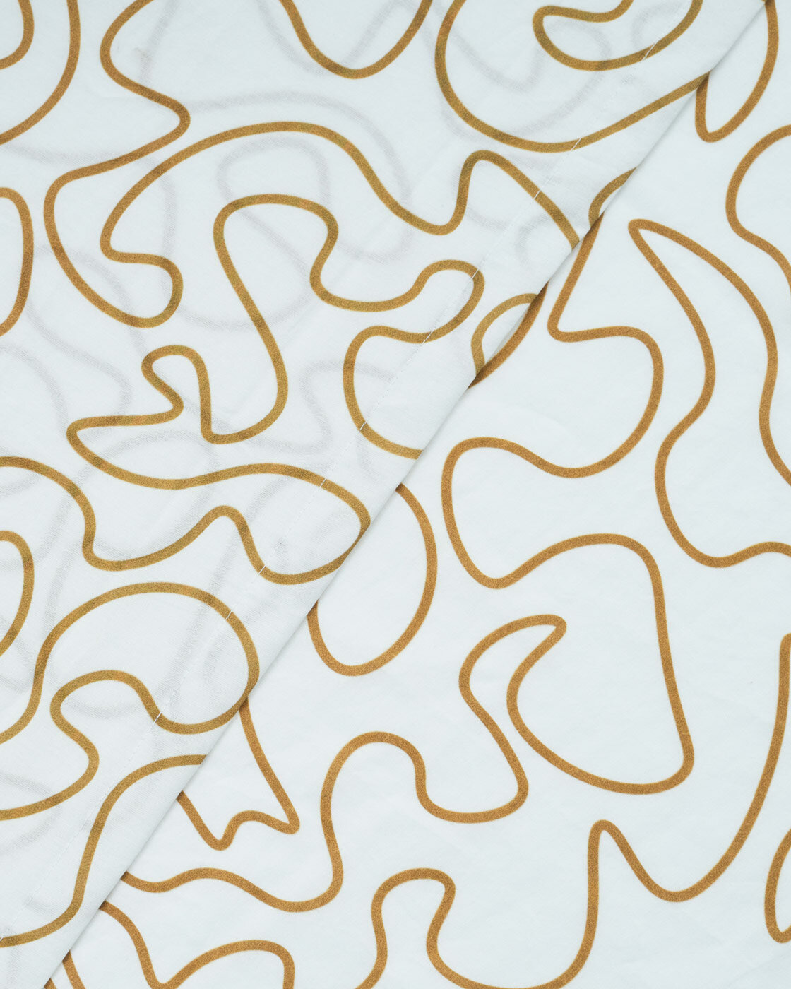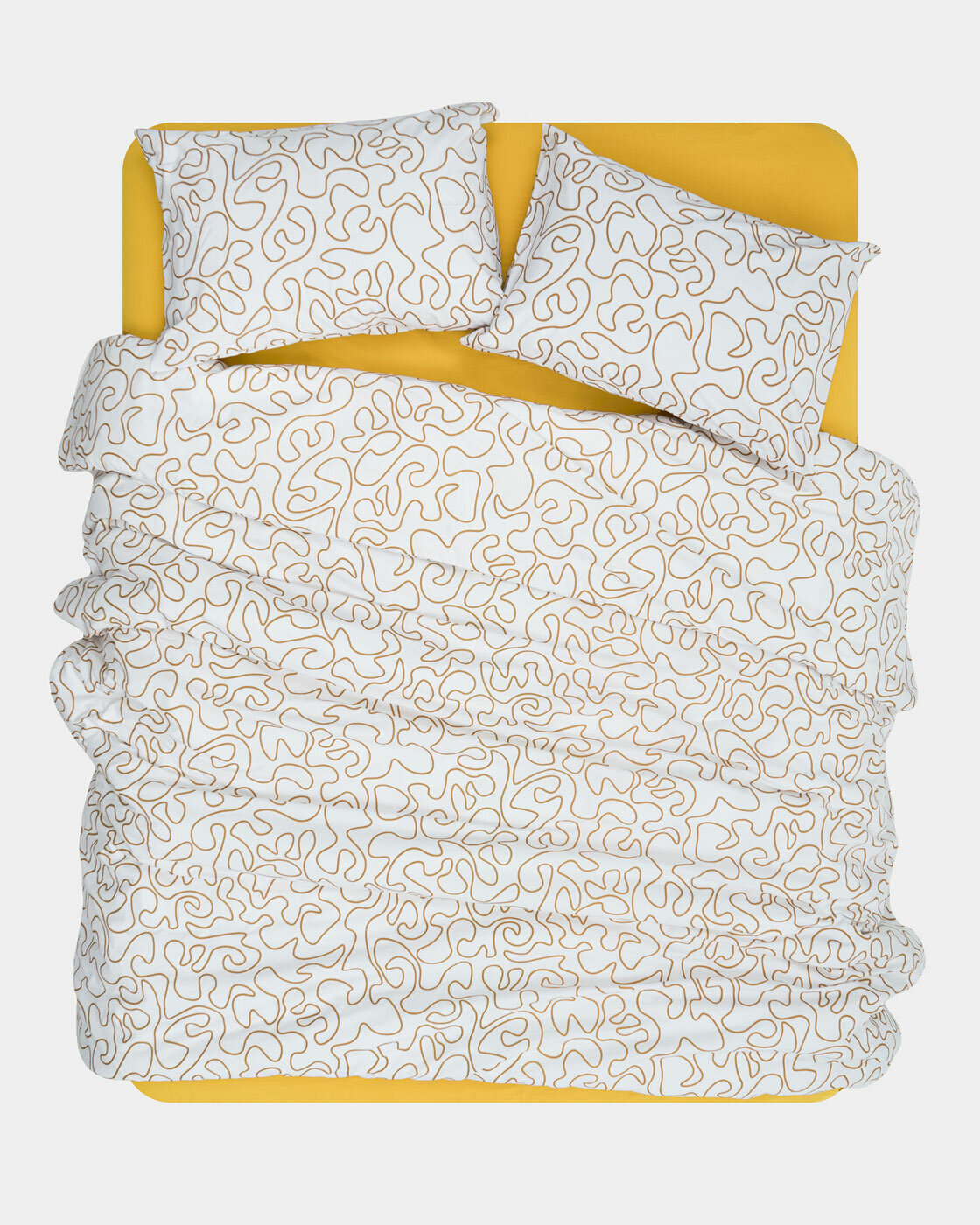 Основные цвета принта “Барханы” - охра и белый. Постельное белье гармонично сочетается с ярким цветом куркумы, чистым белым, глубоким шоколадным, приглушенным лавандовым и сочным виноградным цветами.