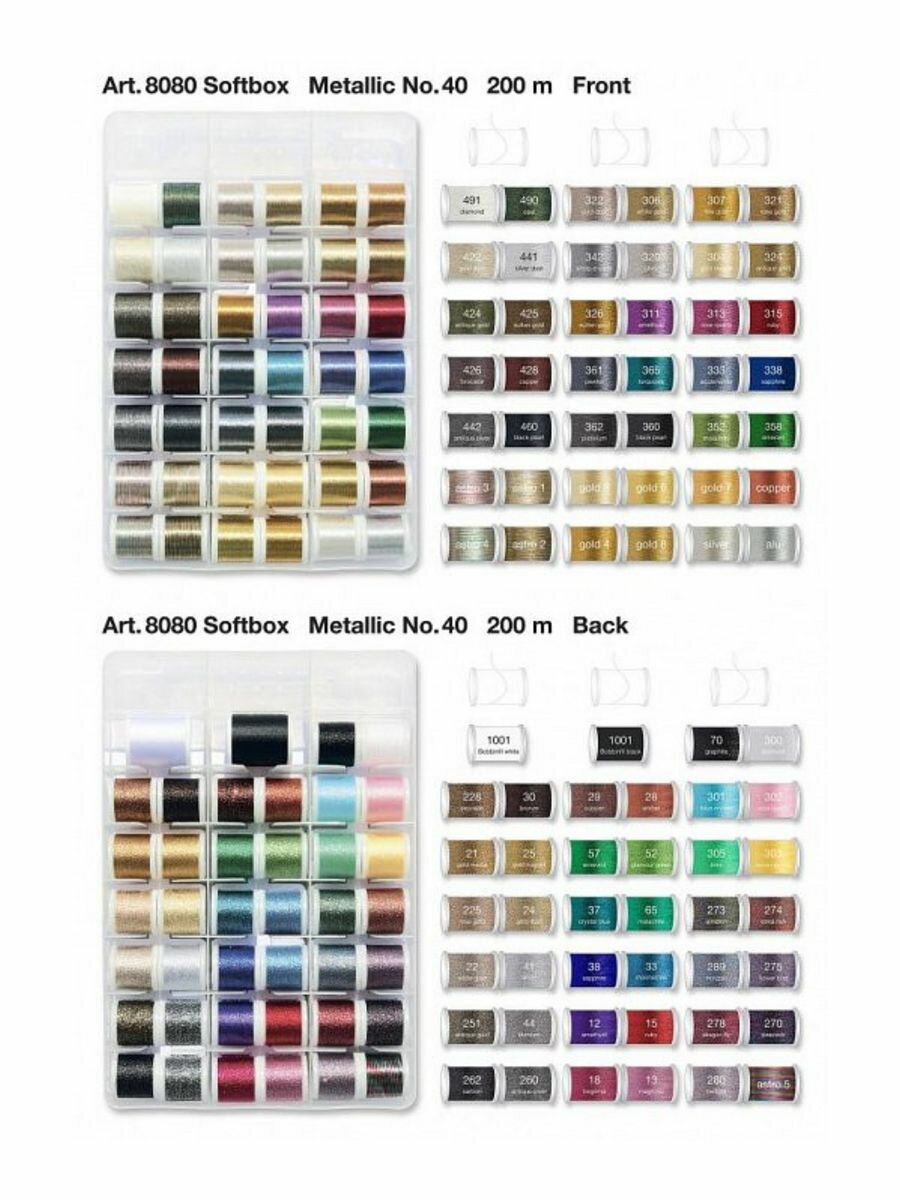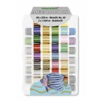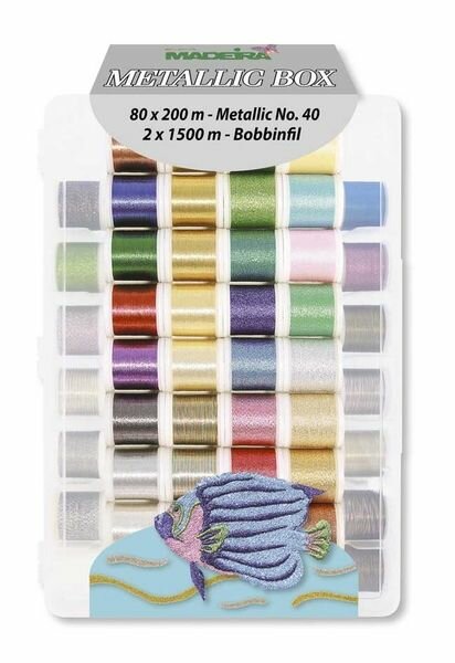 Набор нитей Metallic №40 Madeira арт. 8080 Подходит для всех бытовых швейных и вышивальных машин. Metallic №40 Smooth -благодаря новой технологии скручивания данная нить чрезвычайно гладкая, что делает ее особенно эластичной при вышивании. Metallic №40 Brilliant -металлизация с чистым серебром придает вышивке классическую элегантность и роскошь. Эта нить прекрасно подходит для самых капризных тканей, а при работе на максимальных скоростях машины риск ее разрыва минимален. Metallic №40 Soft-элегантная и мягкая пряжа, выполненная из вискозных волокон, покрытых очень узкой металлической фольгой. Metallic №40 Sparkling-самая популярная металлическая пряжа с эффектом блеска для модной вышивки. Ее секрет в сложном процессе тройного скручивания. Наполнение набора: - 20*200м Smooth Metallic - 13*200м Brilliant Metallic - 37*200м Sparkling Metallic - 10*200м Soft Metallic - 2*1500м Bobbinfil №70 - 1 упаковка игл для металлизированных ниток