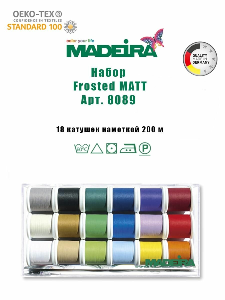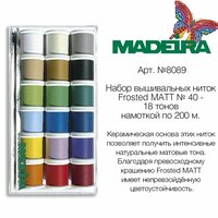 Первые в мире по-настоящему матовые и цветоустойчивые нитки. Вносят совершенно новые аспекты в представление о цвете и диктуют новые параметры цветоустойчивости. Неповторимая керамическая основa этих ниток позволяет получить интенсивные натуральные матовые тона, которые непохожи на тона известных до сих пор вышивальных ниток. Благодаря превосходному крашению Frosted MATT имеет непревзойдённую цветоустойчивость. Красота оттенков остаётся надолго и не выцветает как на обыкновенных однoтoнных нитках.