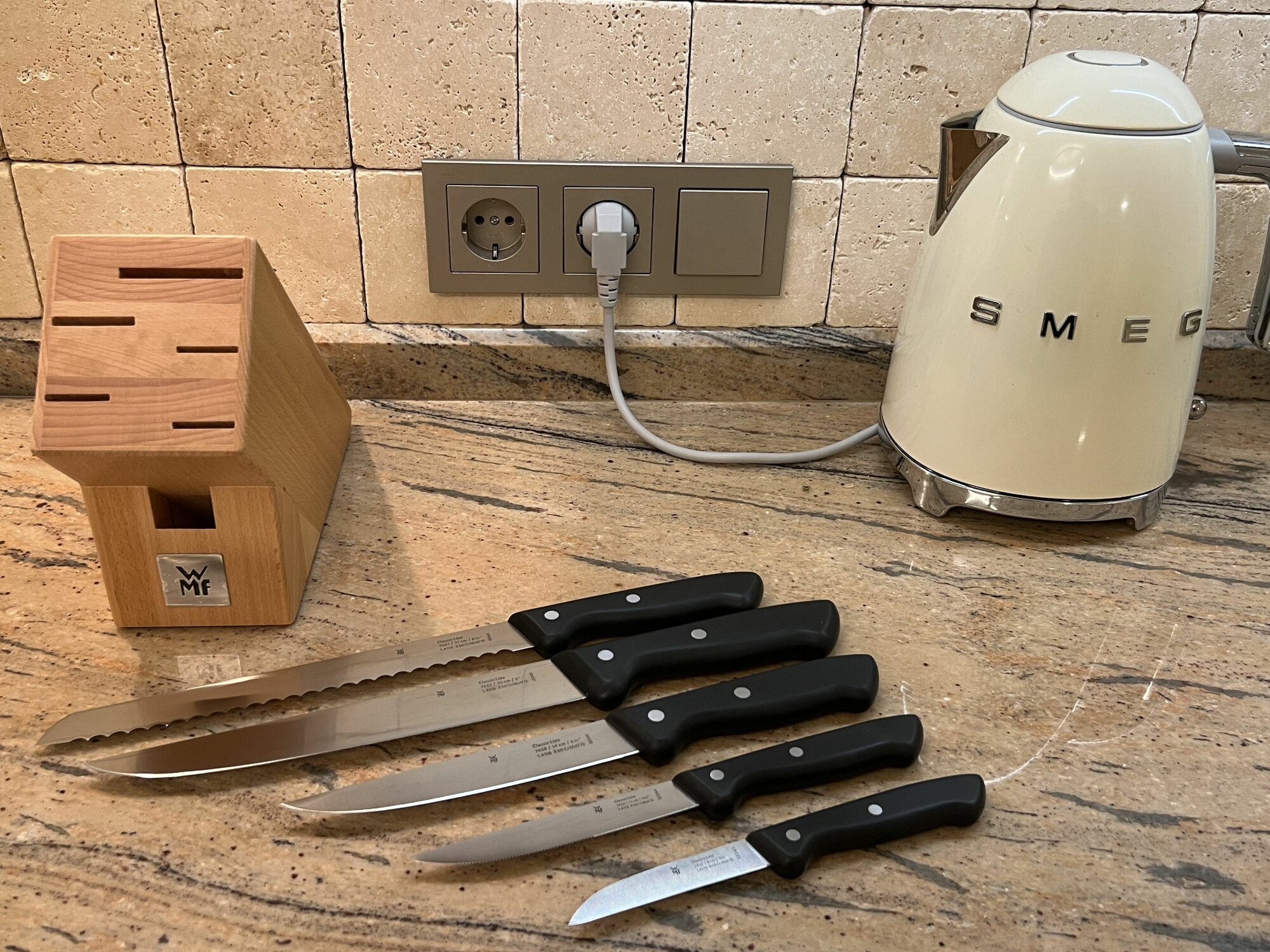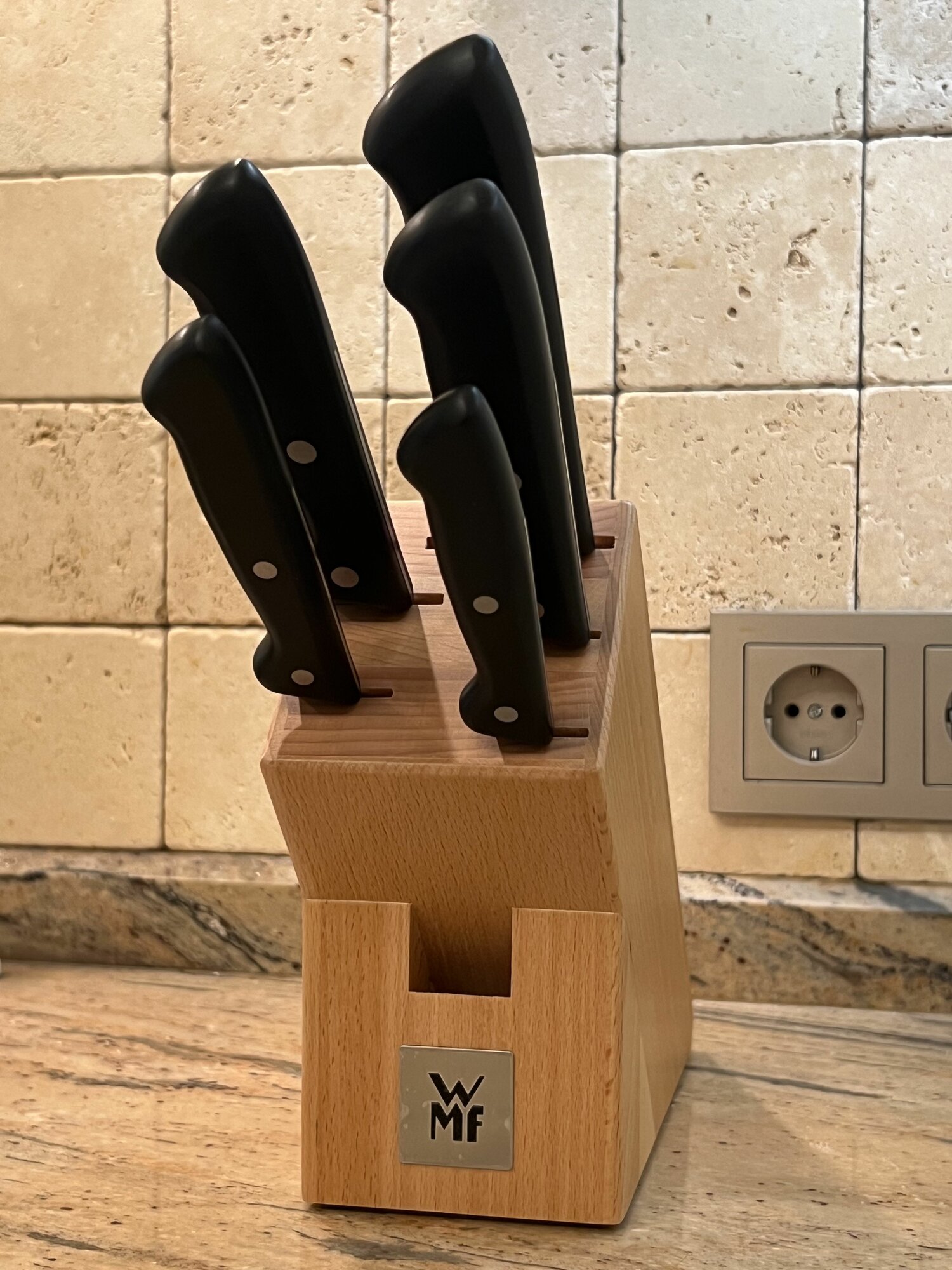 Подставка для ножей, Овощной нож 8 см, Универсальный нож 14 см, Хлебный нож 21 см, Разделочный нож 20 см, Стейк нож 11 см,