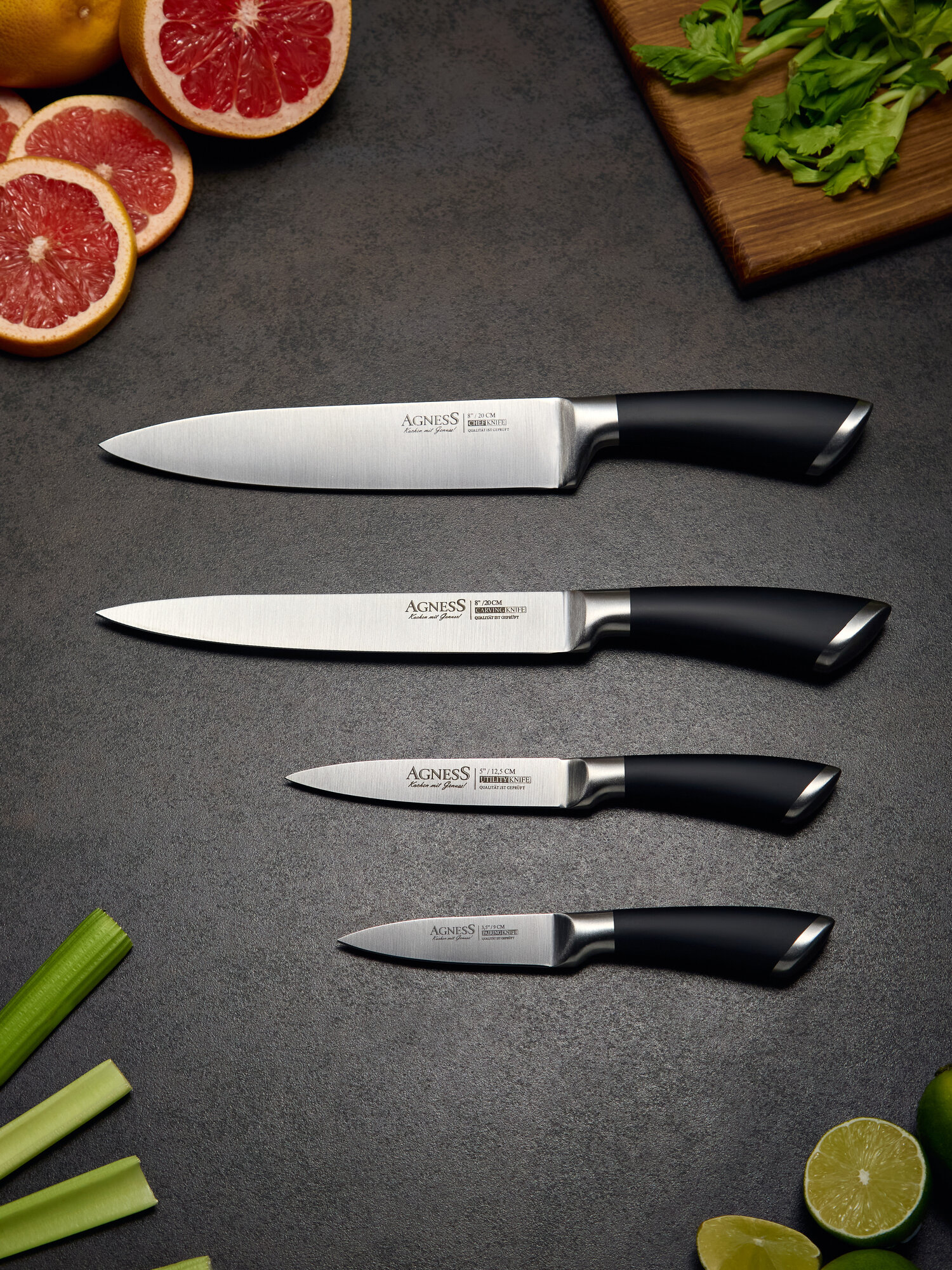 Набор ножей Agness "Midnight" - это превосходный выбор для тех, кто ценит качество и функциональность на своей кухне. В комплект входят 4 ножа, каждый из которых обладает своими уникальными особенностями.