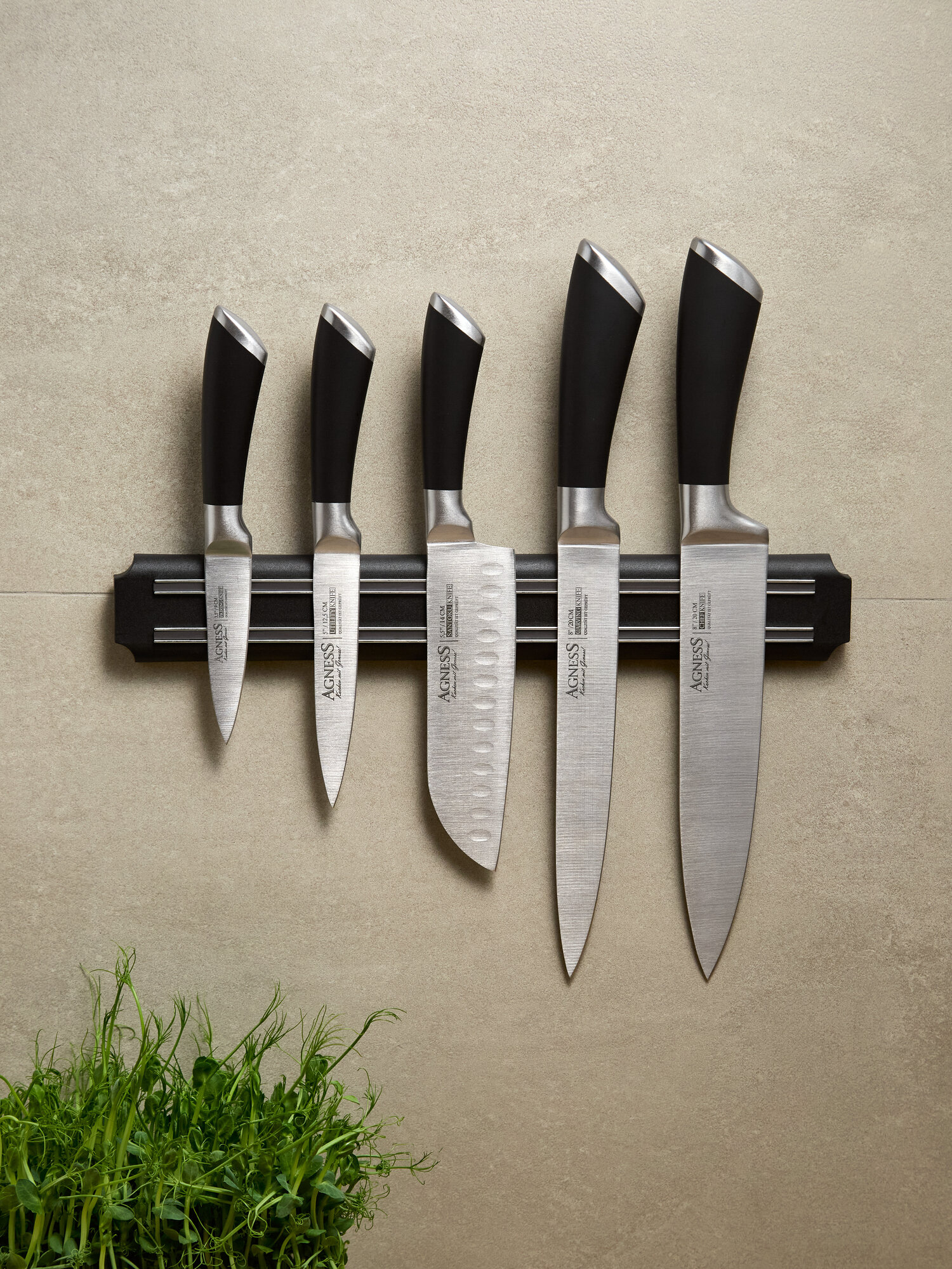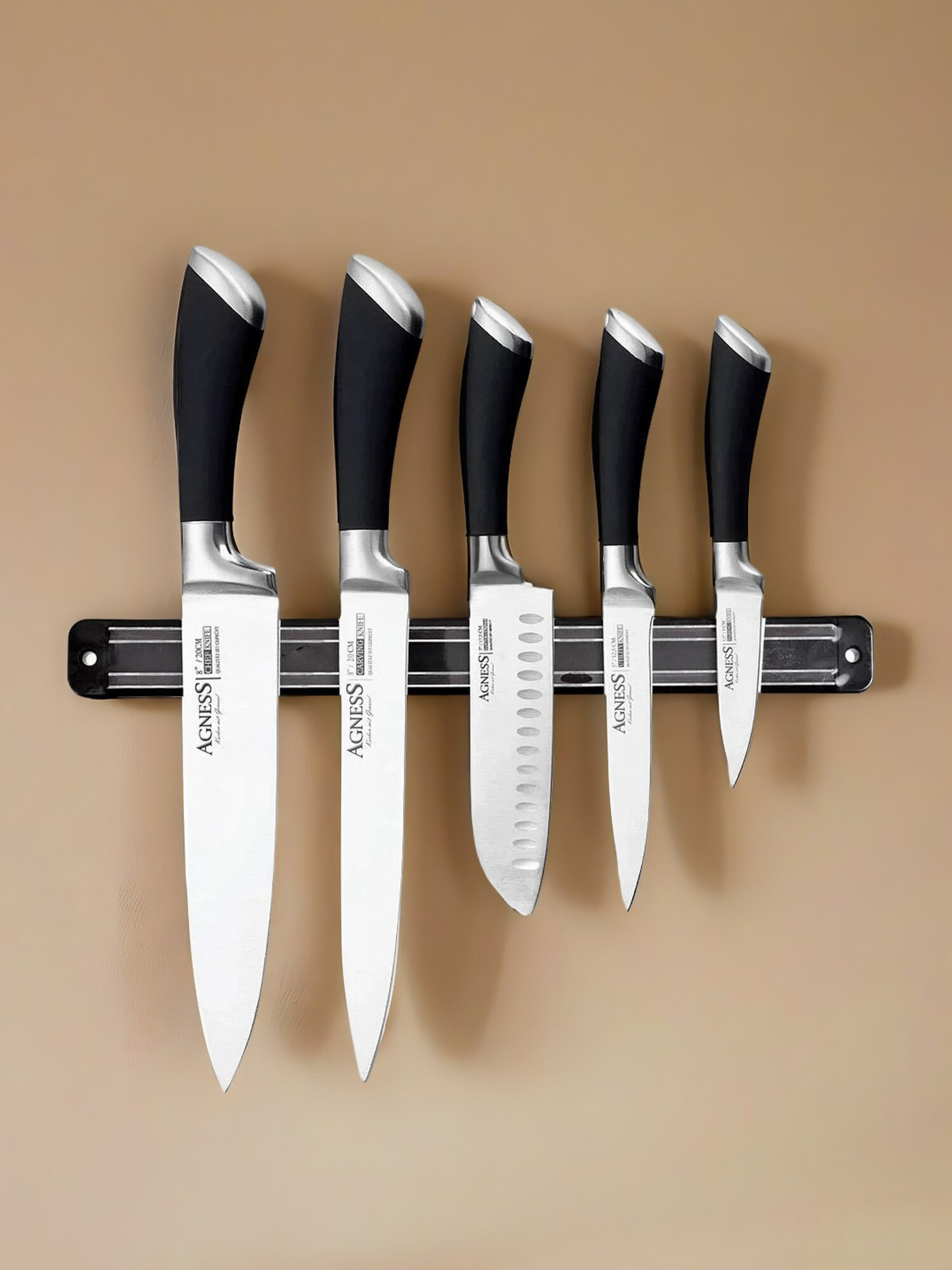 | Подробная комплектация | Набор ножей AGNESS 6 предметов с магнитным держателем нерж.сталь, пластик черные |