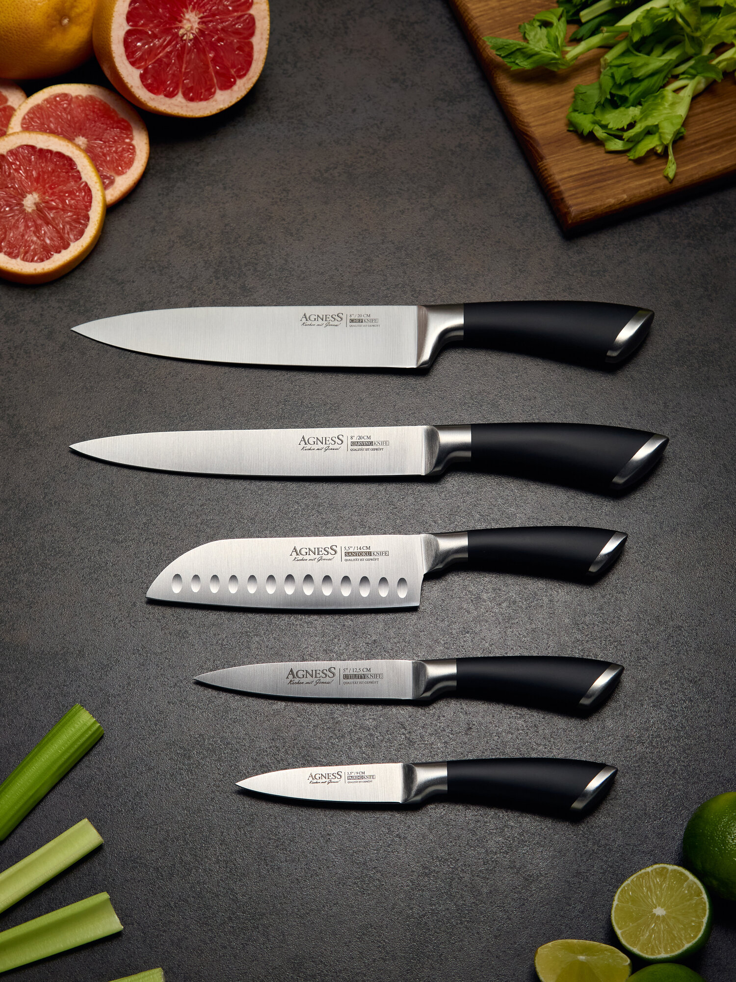 | Состав набора ножей | нож для овощей, нож сантоку, разделочный нож, универсальный нож, шеф-нож |