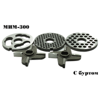 Набор ножей и решеток с буртом для мясорубки МИМ-300: МИМ-300М . Данный комплект предназначен для промышленных мясорубок, использующихся на предприятиях общепита, в производственных цехах , на предприятиях торговли, которые занимаются выпуском гастрономических товаров, измельчением мяса, и рыбы на фарш. Толщина ножа( с буртом) 16 мм, диаметр внешний 75 мм. В набор входят следующие детали: нож , двухсторонний с буртом, посадочное отверстие 16 мм, внешний размер 75мм, вес 131г- 2 шт; нож подрезной - 1 шт, с буртом, посадочный ( внутренний) диаметр -22мм, внешний диаметр 82 мм, толщина 9 мм, вес 157 г; решетка №2-1 шт, с буртом, внешний диаметр 82 мм, посадочный( внутренний) диаметр 22 мм, толщина 9 мм, отверстий на решетке, диаметром 5 мм- 89 шт, вес 179 г; решетка №3 - 1шт, с буртом, внешний диаметр 82 мм, посадочный (внутренний)- 22 мм, толщина 9 мм, диаметр отверстий на решетке 9мм , количество отверстий- 30 шт, вес 175 г. Общий вес комплекта МИМ-300 ( с буртом )- 773 г. Детали выполнены из качественной нержавеющей стали . Используется в профессиональных мясорубках, работающих с большим объемом мясной продукции, предназначен для мелкого измельчения. Подходит для промышленных мясорубок МИМ-300 и МИМ-300М; ТМ-32 и ТМ 32М торгтехмаш Барановичи Беларусь.
