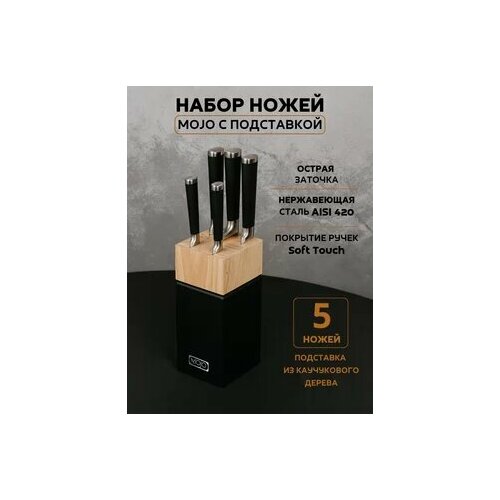 Набор ножей кухонных на подставке MOJO - незаменимый инструмент на любой кухне. Ножи кухонные гармонично смотрятся на кухне, не занимают много места на рабочей поверхности. Набор ножей с подставкой - идеальный выбор для профессиональных поваров и любителей кулинарии. Лезвие ножей тонкое и прочное, держит заточку. Ножи выполнены из высококачественной нержавеющей стали, меньше затупляются, не окисляются, не влияют на вкус готовых блюд. Ножи с подставкой идеально подойдут для резки как мяса и рыбы, так и фруктов и овощей. Прочная эргономичная и удобная рукоятка каждого ножа, выполненная из нержавеющей стали с покрытием «Soft Touch», удобно ложится в ладонь, обеспечивая безопасную работу, комфортное положение в руке и надежный захват. А стильная компактная подставка для ножей из каучукового дерева сэкономит и украсит пространство на вашей кухне, удобно организует хранение. Профессиональные ножи выдерживают любые испытания, они долговечные, что делает их идеальными инструментами для готовки блюд в домашних условиях. Универсальный нож может использоваться для филе, нарезки овощей. Нож для нарезки овощей поможет создать красивые и тонкие ломтики и легко нарежет продукты с твердой кожицей и нежной мякотью. Подходят для резки и чистки овощей и фруктов. Нож для мяса разделочный легко справиться с нарезкой стейка, шашлыка. Разделочный нож можно использовать не только для мяса, но и для рыбы. Нож поварской подходит для нарезания любых продуктов. Зубчатый нож для хлеба предназначен для нарезки буханок, булок, кекcов и другой выпечки.