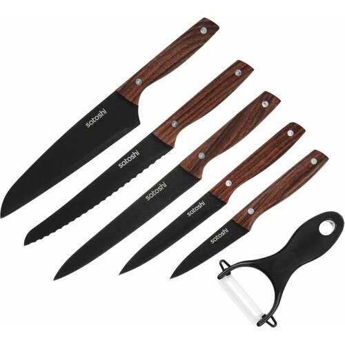 Набор кухонных ножей SATOSHI «Меллер» включает 5 ножей, овощечистку и магнитную коробку для их хранения. Комплект ножей поможет выполнять различные задачи на кухне по разделке, нарезке и шинковке продуктов. Нож-шеф с длиной клинка 20 см удобен для быстрой нарезки овощей, зелени и фруктов. Универсальные ножи 12,7 см и 20 см справятся с чисткой овощей и разделкой мяса и рыбы. Маленький нож 9 см удобен для вскрытия упаковок, мелких нарезок и чистки продуктов от кожуры. Хлебный нож 20 см позволит нарезать хлебобулочные изделия на идеальные ломтики без образования крошек. Овощечистка с горизонтальным лезвием из нержавеющей стали предназначена для очистки овощей и фруктов. Тонко снимает кожуру с картофеля, яблок, свеклы, моркови. Может также использоваться для нарезания тончайших ломтиков овощей, например, огурцов для создания эффектного декора для сервировки блюд. Лезвия из нержавеющей стали имеют острую заводскую заточку, не подвержены коррозии, а также имеют антиналипающее покрытие.