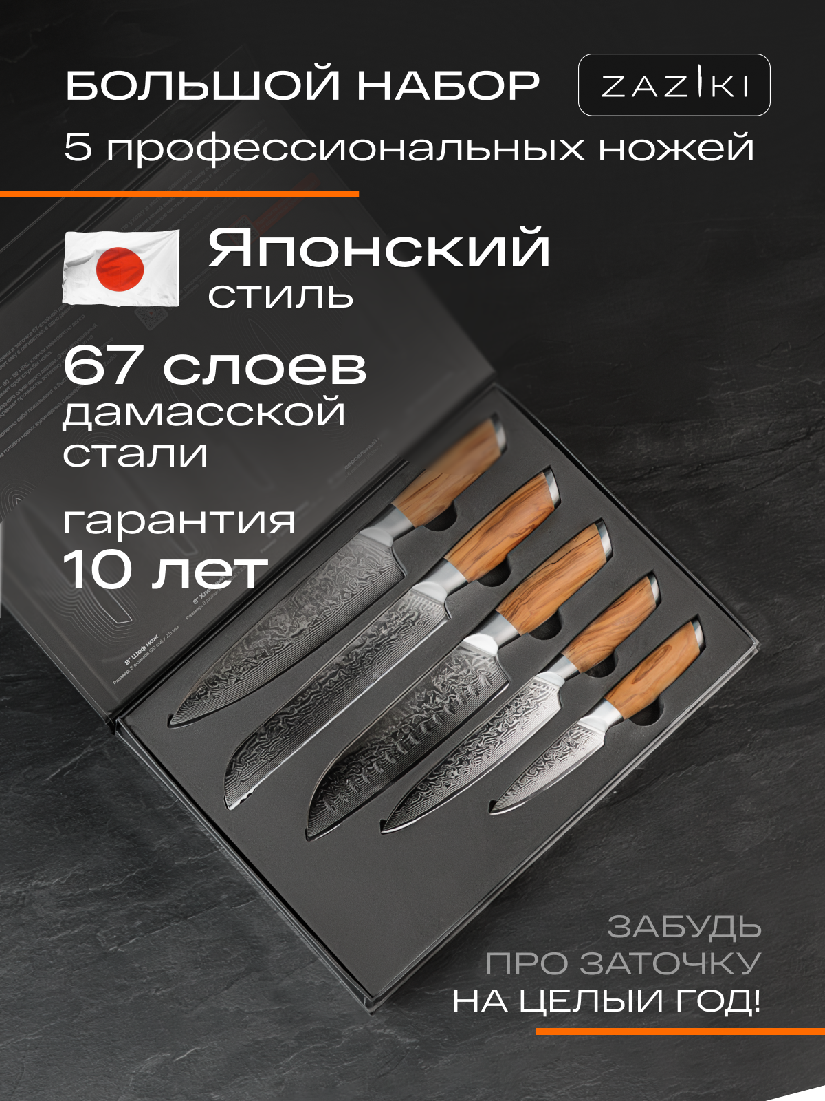 Набор ножей кухонных Zaziki профессиональных поварских 5 шт из дамасской стали: сравнение цен, характеристики, фото, актуальное наличие и цены.