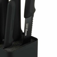 Набор ножей кухонных SATOSHI «Бреан» на подставке с полипропиленовыми разделителями включает 5 практичных ножей, которые подходят для любых кулинарных целей: для шинковки в шефской технике, обвалки, деликатной тонкой нарезки, рубки и чистки овощей и фруктов. Набор ножей имеет стильный дизайн, поэтому займет достойное место в интерьере кухне, а также компактно разместится на столешнице. Ножи имеют острую заточку, а лезвия из высококачественной нержавеющей стали с антиналипающим и антибактериальным покрытием не боятся коррозии и долго сохраняют остроту. Эргономичные рукоятки не вызывают усталости в кисти даже при длительной работе. Отличное решение для домашней кухни. В наборе имеется шеф-нож, который является настоящей работой легенды на кухне. Этот нож оснащен острым лезвием, которое идеально подходит для нарезки мяса и овощей. Нож для овощей позволит легко и быстро нарезать и очищать фрукты и овощи. Оно имеет короткое и острое лезвие, которое легко проникает сквозь кожуры и выжимает максимум сока из цитрусовых и прочих фруктов. Универсальный нож позволит справиться с широким спектром задач, будь то нарезка мяса, разделка птицы или нарезка сыра. Нож для хлеба оснащен зазубренным лезвием, которое легко прореживает хрустящую корку и равномерно нарезает хлебный продукт. Нож для нарезки обладает длинным тонким лезвием, которое позволит легко нарезать ровные и тонкие ломтики мяса, рыбы или колбасы. Подставка с наполнителем предназначена для удобного хранения и организации ножей. Она не только обеспечит легкость доступа к ножам, но и стильно дополнит интерьер вашей кухни. Набор ножей с подставкой является идеальным аксессуаром для любого кухонного профессионала или просто любителя готовить.