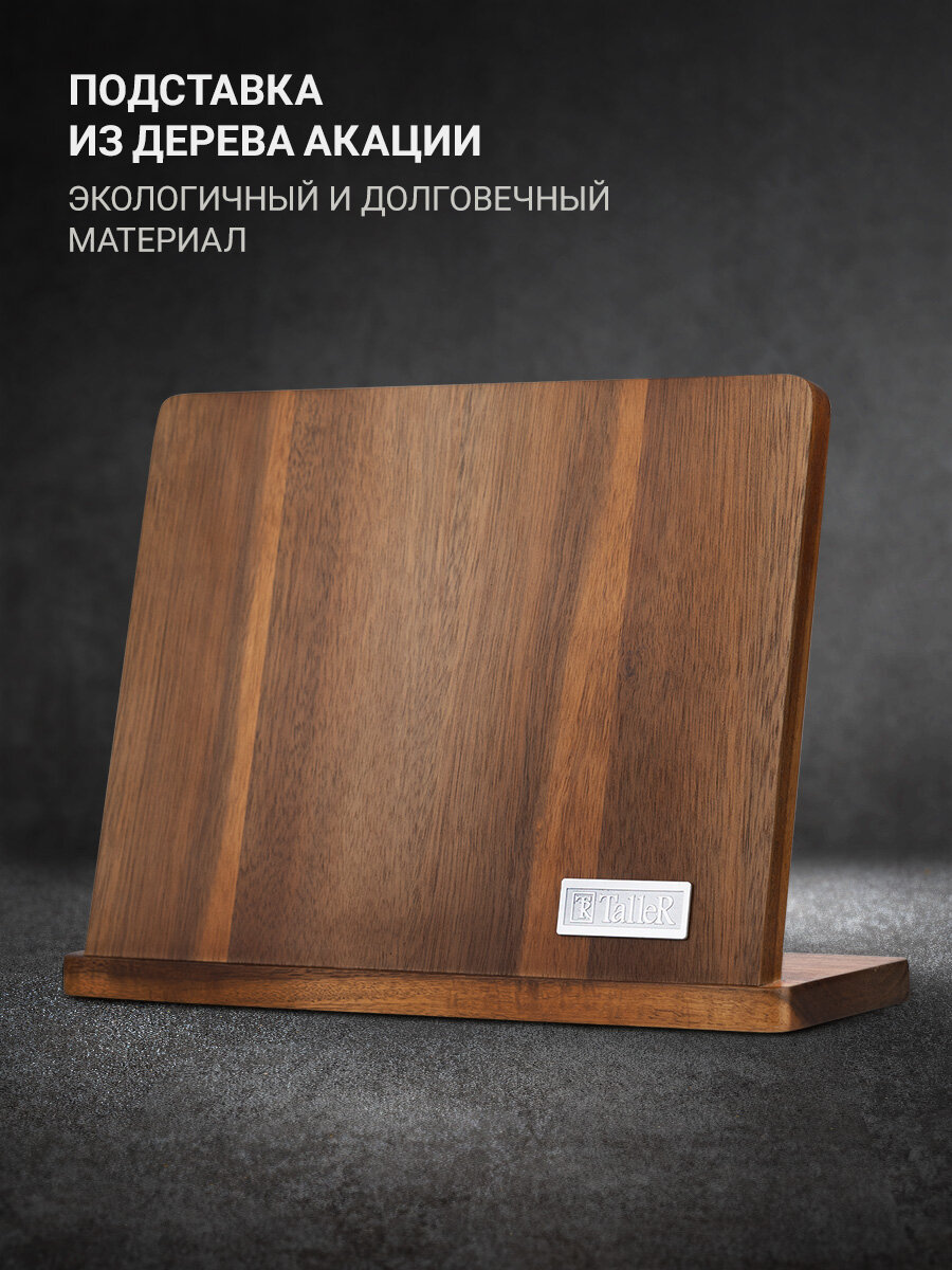 Магнитная подставка из дерева акации, входящая в комплект, обеспечивает надежное крепление ножей и их удобное хранение. Магнит внутри подставки отлично удерживает ножи, что делает их всегда под рукой.