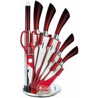 Набор из 8 предметов с подставкой. Кухонный топорик (30,5/16,8), нож поварской(33,5/20см), нож для нарезки хлеба(33/19,7см),нож универсальный(23/12см), нож для очистки(19,5/8,4см), точилка для ножей(длина 30,3см), ножницы(длина 20см