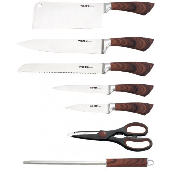 Набор ножей Winner WR-7352 включает в себя 8 предметов, которые станут незаменимыми помощниками на вашей кухне. В комплект входят: подставка, ножницы кухонные, точилка/мусат.