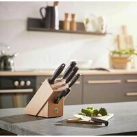 Блок для ножей изготовлен из бука и впечатляет своим натуральным видом и прочностью. Прочные пластиковые и бесшовные ручки удобно ложатся в руку, благодаря чему разрезы каждый раз получаются точными и аккуратными. Больстер защищает пальцы и предотвращает скольжение и риск пореза.