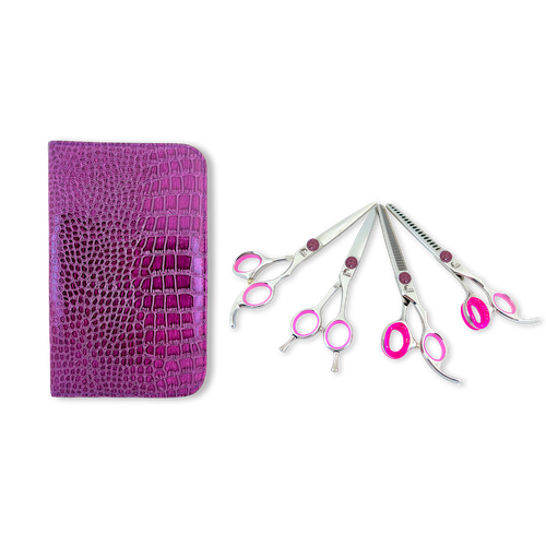 Набор комплектуется глянцевым чехлом на молнии (26*16*4 см) c фактурой крокодила, с мягкой вставкой разделителем которая предохраняет ножницы от царапин.