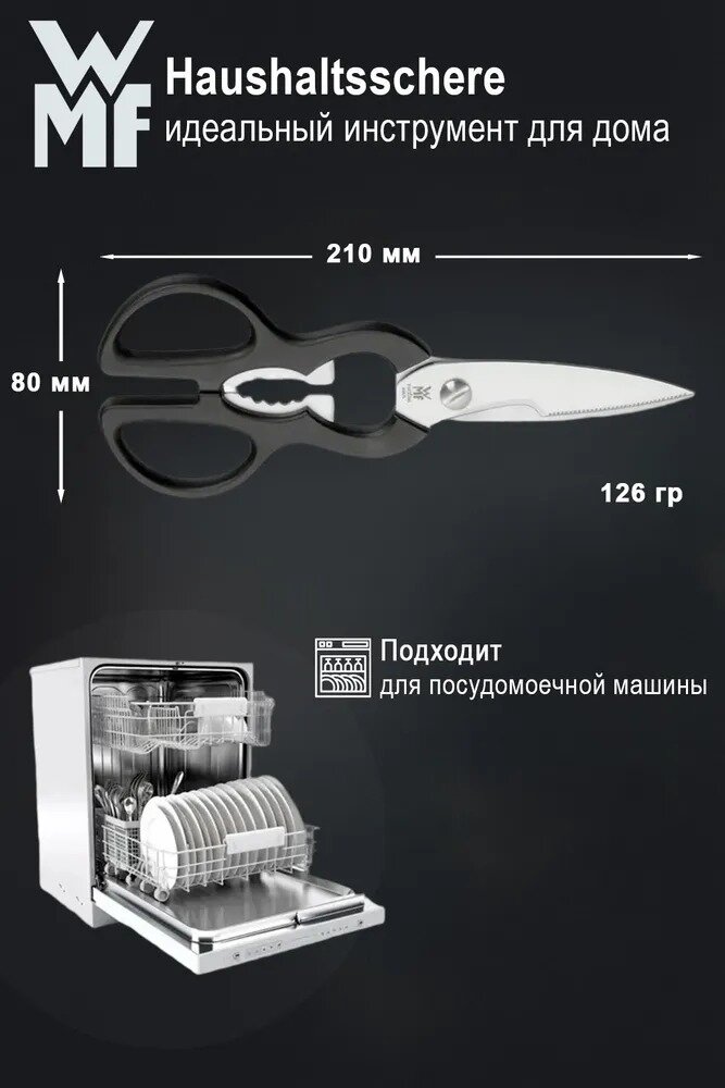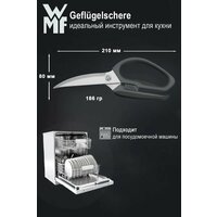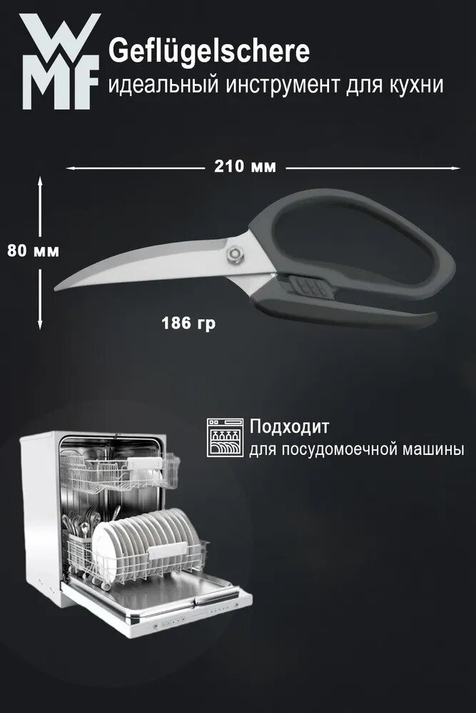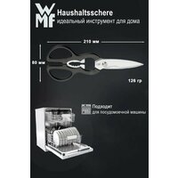 Профессиональные ножницы WMF Gourmet для мяса и рыбыЭтот инструмент повышенной прочности спроектирован для любых задач, как на кухне, так и домашних бытовых. Вы можете резать им упаковки, продукты, небольшие кости и мясо.