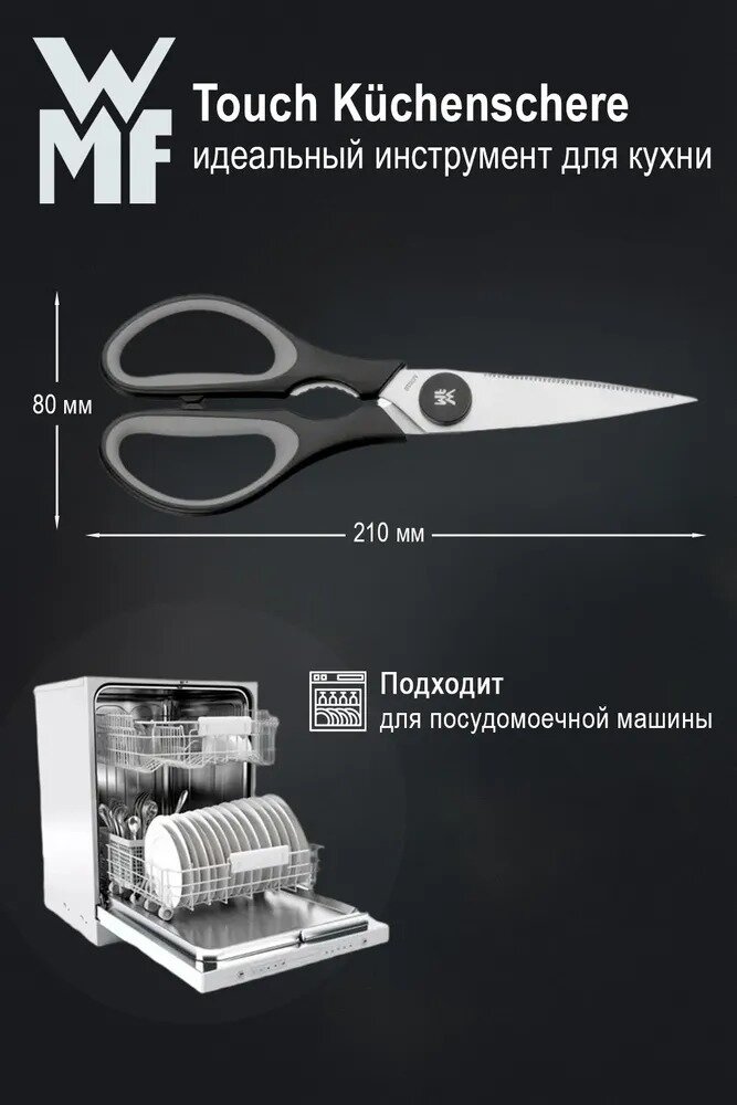 Универсальные кухонные ножницы WMF TouchВаш главный ежедневный помощник. Идеальны для нарезки свежей зелени, петрушки, укропа и зеленого лука прямо в салат. Легко разрежут упаковку продуктов, вскроют вакуумную упаковку или пакет с заморозкой. Эргономичные ручки обеспечивают невероятный комфорт и надежный хват.