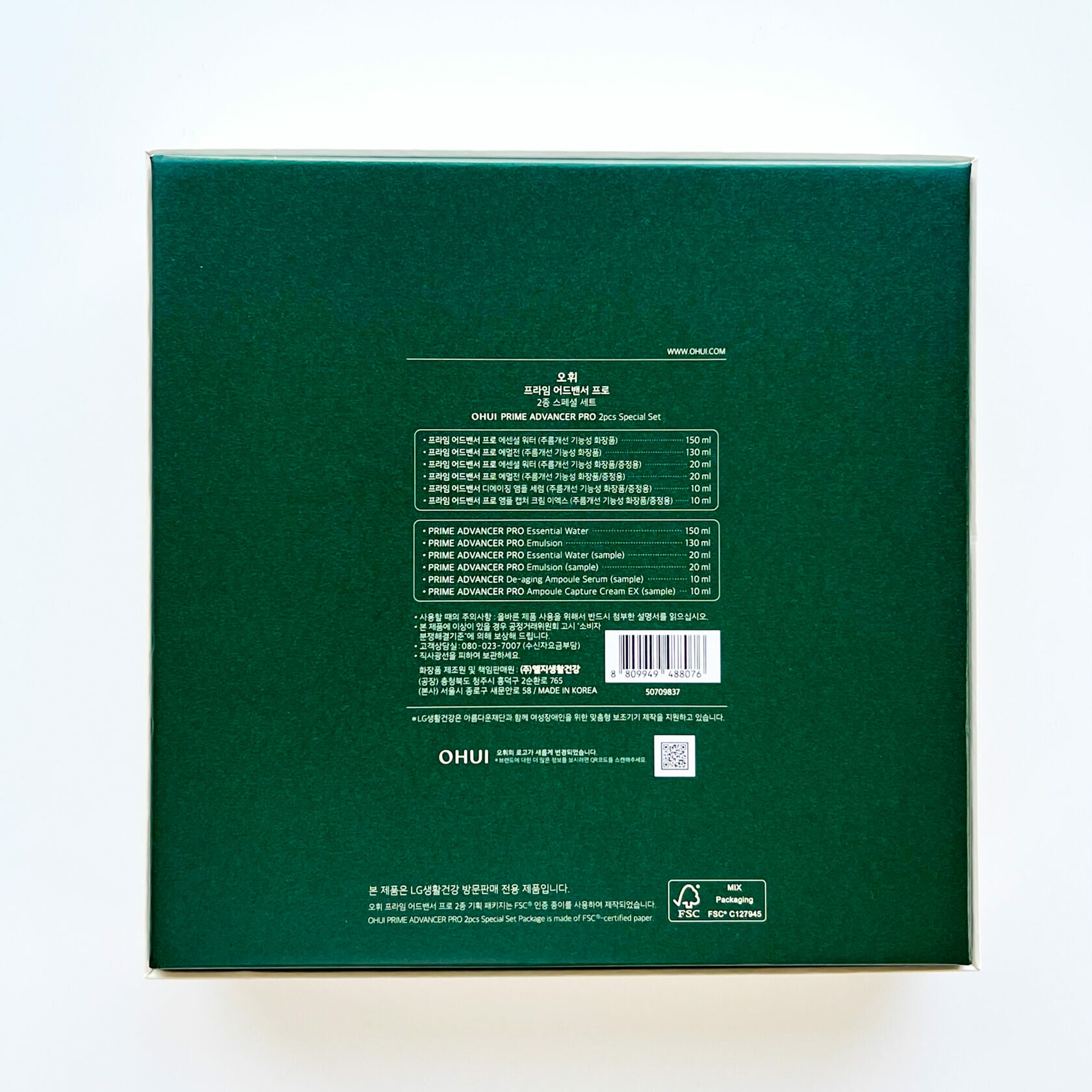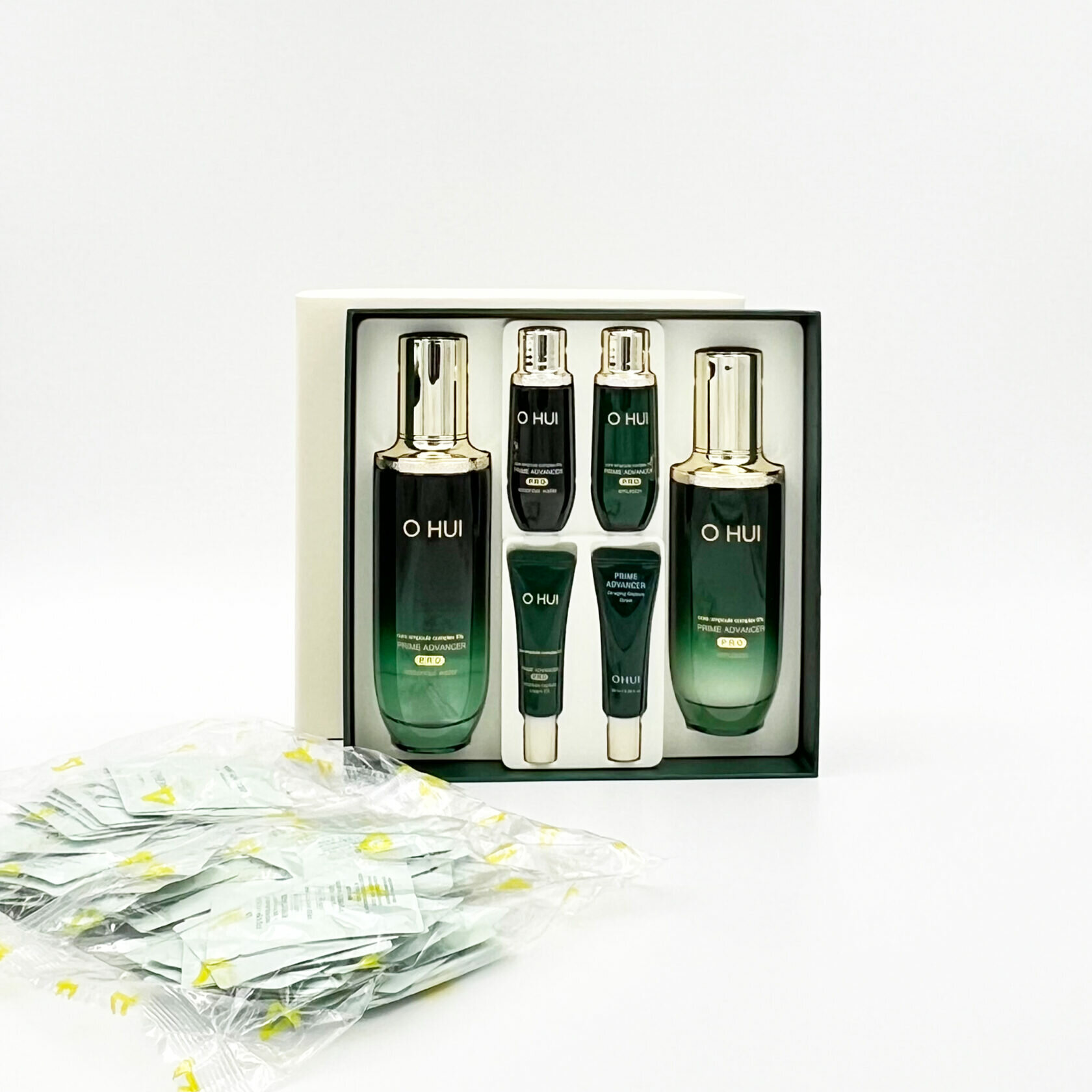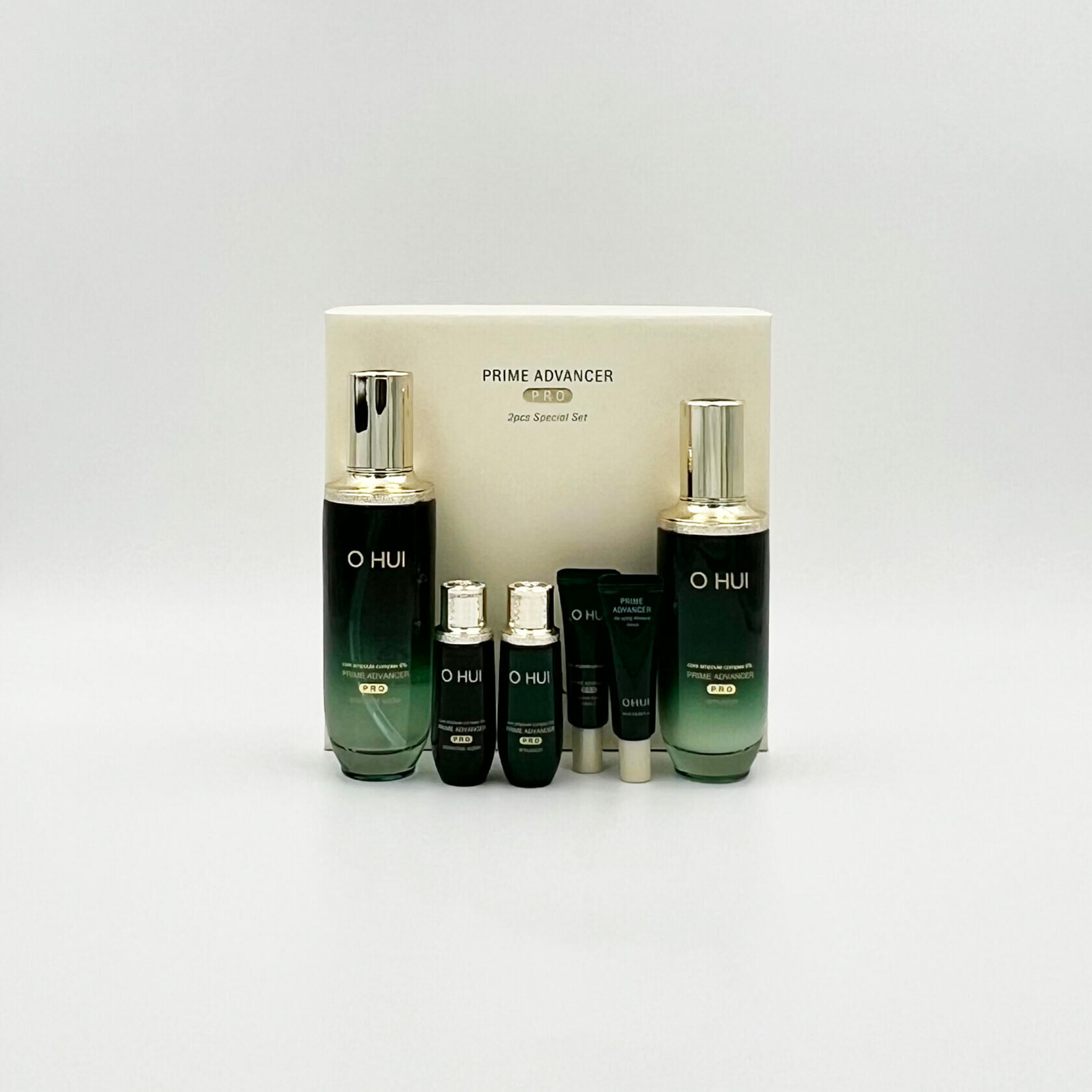 | Состав набора | O HUI Prime Advancer PRO Essential Water - тонер 150мл O HUI Prime Advancer PRO Emulsion - эмульсия 130мл Prime Advancer PRO Essential Water - тонер 20мл Prime Advancer PRO Emulsion - эмульсия 20мл Prime Advancer PRO Ampoule Capture Cream EX - капсульный крем для лица 7мл Prime Advancer PRO Ampoule Eye Cream - крем для глаз 5мл |