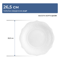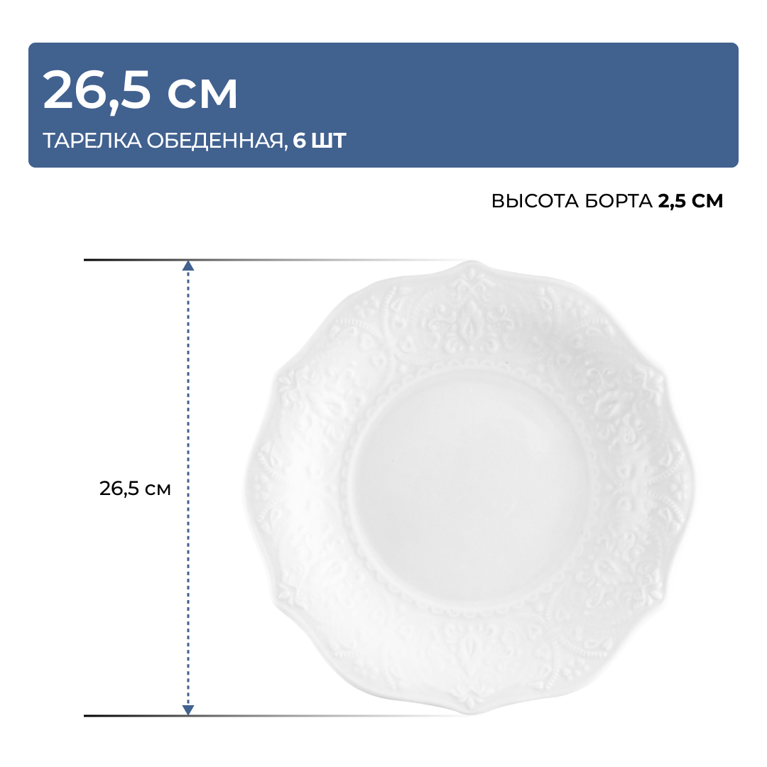 Набор обеденных тарелок 26.5 см от Tudor England - это стильный выбор для сервировки вашего стола. Коллекция Royal Whitehall изящная, привлекательная, ажурная, белоснежная и очень практичная. Все тарелки из этой коллекции можно мыть в посудомоечной машине и использовать в микроволновых печах. Фарфор Tudor England обладает такими характеристиками как: укрепленный край от сколов, особо прочная глазурь, минимальная пористость, практичность и долговечность. В наборе 6 тарелок 26.5 см