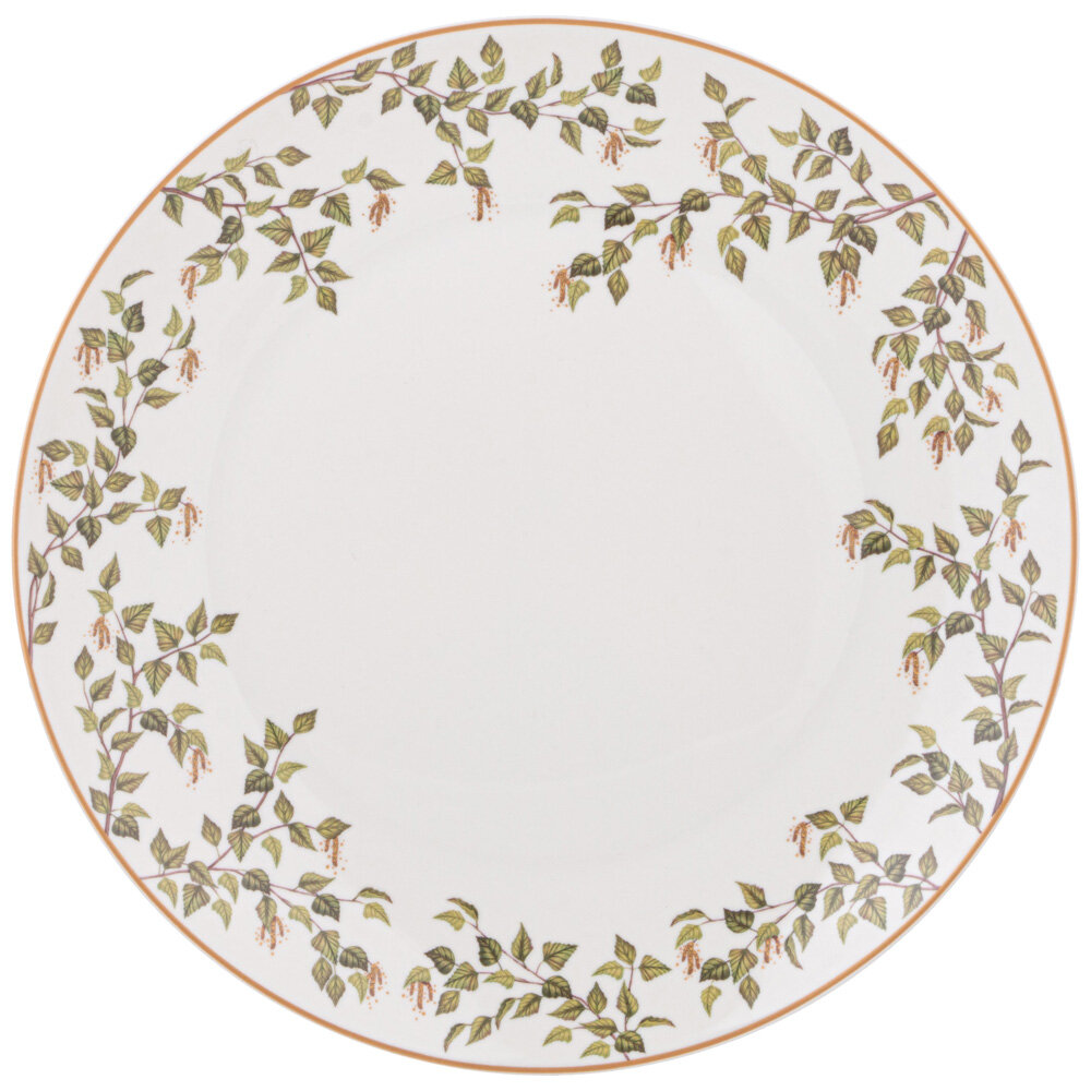 Деколь тарелок изображает тонкие веточки березы с нежно-зелеными листочками, дополненными золотистыми серёжками. Это изумительно уютный вариант сервировки и подачи горячих и холодных блюд, нарезки, фруктов или десерта для себя и близких.