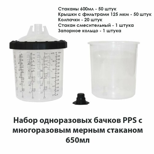 Комплект одноразовых бачков ( PPS предназначен для использования с любыми краскопультами с верхними бачками при наличии специальных переходников под стакан PPS вместо штатного верхнего бачка. Система существенно экономит как время на промывку краскопульта, так и расход растворителей для мойки оборудования. При использовании системы PPS не требуется фильтра-воронки и мерной тары за счет наличия встроенного фильтра на 125 микрон, а так же системы разметки для смешивания по объёму. Набор не содержит переходники.