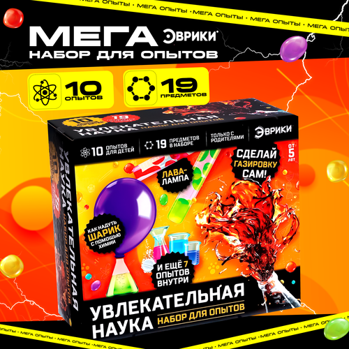 С набором для опытов «Эврики» ребёнок узнает об удивительных свойствах химии, проведёт 10 увлекательных экспериментов дома и удивит своих друзей. Сначала все процессы покажутся настоящими чудесами и фокусами, но на самом деле всё происходящее легко объясняется законами природы. В комплект входят следующие опыты: «Молочный художник»; «Лава-лампа»; «Шпионское послание»; «Четыре этажа сахара»; «Радуга в пробирке»; «Как надуть шарик, не прикасаясь к нему?»; «Греет ли шуба?»; «Танец хлопьев»; «Вулкан»; «Газировка».