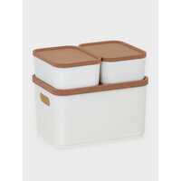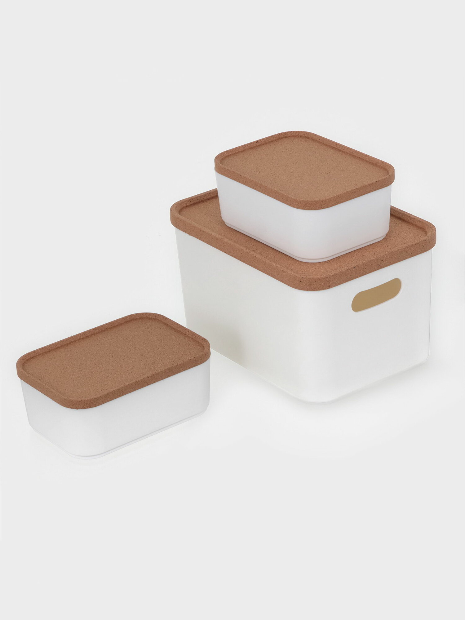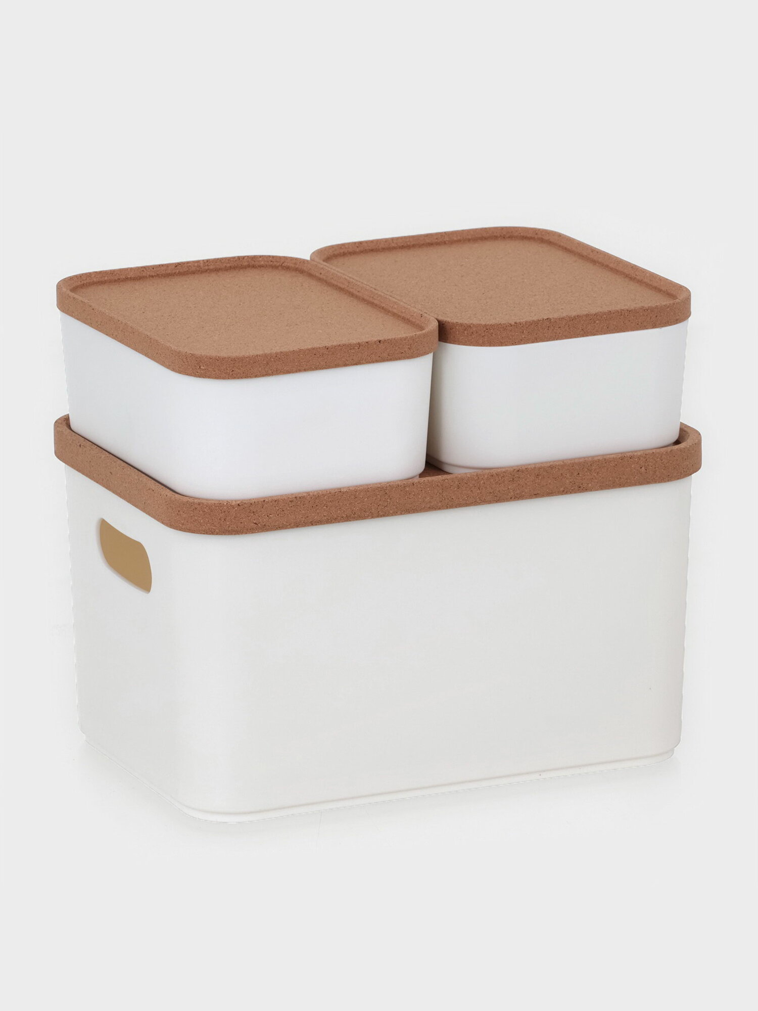 Артикул: 0540-067. Размеры: 19.5 x 17 x 24 см, Материал: Пластик, Вес: 595 гр, Объём, л: 0.76, Размер упаковки: 17 x 19.5 x 24 см, Высота, см: 19.5, Ширина, см: 17, Назначение: Для домашних мелочей, Температурное ограничение: Нет, Колёса/ролики: Нет, Крышка: Да, Рисунок: Нет, Вид: Контейнер, Цвет: Бежевый. Набор состоит из 3 органайзеров с крышками: одного большого, объёмом 2,4 л, и двух маленьких, объёмом 0,76 л Крышки сделаны из экологически чистого, безопасного и возобновляемого материала коры пробкового дерева. Её срезают, когда дерево достигает 25-летнего возраста. Процесс повторятся каждые 9–10 лет, что помогает восстановить слой коры и не вредит деревьям. Органайзеры подойдут для хранения тюбиков, баночек, бутылочек, флаконов и коробочек с косметикой и гигиеническими принадлежностями, маникюрных принадлежностей, канцелярских товаров, детских игрушек. Боксы устанавливаются друг на друга, что экономит место. Крышки с бортиками можно использовать как подставки для мелочей. Изделия можно применять везде: от ванной комнаты до рабочего стола. Размеры набора позволяют вместить в себя и мелочь и крупные вещи. Две емкости Korely mini идеально помещаются сверху на крышке. Большая корзина имеет ручки для перемещения набора. Изделия выполнены в изящном цветовом сочетании: пробка и пластик цвета слоновой кости хорошо дополняют друг друга. Корпус из пластика отличается долговечностью и не впитывает запахи.