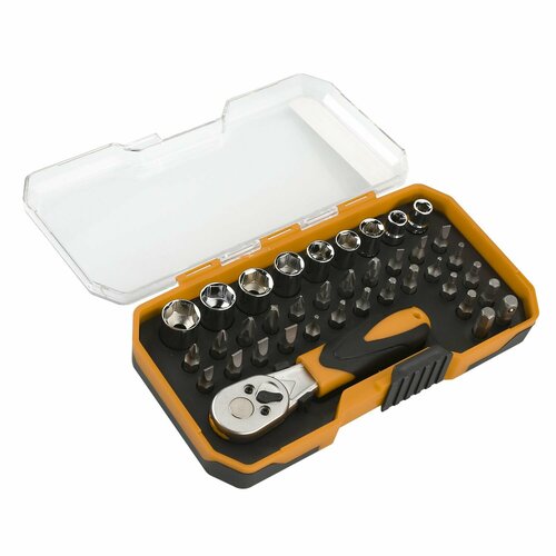 4 х Phillips: 0-#1-#2-#3 4 х Pozidrive: 0-#1-#2-#3 7 х Slotted: 3мм-3.5мм-4мм-4.5мм-5мм-5.5мм-6мм 5 х Torx: 10мм-15мм-20мм-25мм-30мм 7 х Hex: 2мм-2.5мм-3мм-3.5мм-4мм-5мм-6мм 1 х 25мм Адаптер 9 х Патроны: 5мм-6мм-7мм-8мм-9мм-10мм-11мм-12мм-13мм 1 х 1/4" Ручка с трещоткой