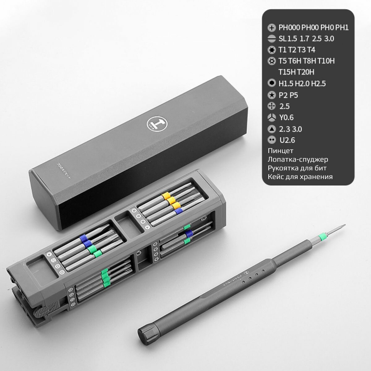 Набор включает в себя 28 различных бит, рукоятку для бит, пинцет и лопатку-спуджер, предназначенных для самых точных и тонких ремонтных работ. Всё, что вам нужно, в одном инструменте.