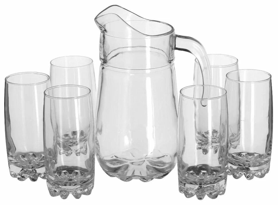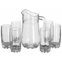 кувшин и стаканы выполнены из прозрачного стекла, стаканы имеют рифленую нижнюю часть, упаковка картонная коробка, подходит для подачи холодных напитков, классический универсальный дизайн, не содержит дополнительных аксессуаров