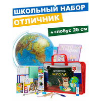 Набор первоклассника Отличник 31 предмет в папке - это базовый комплект товаров для ученика 1 класса, упакованный в яркую папку с ручкой. Набор составлен на основе советов учителей начальных классов и пожеланий родителей. Набор является традиционным подарком выпускнику детского сада. В состав набора Отличник входят только сертифицированные отечественные и импортные школьные принадлежности, соответствующие требованиям по безопасности детских товаров законодательства РФ. Состав: Тетрадь 12л. в клетку (зеленая обложка.) - 5шт. Тетрадь 12л. в косую линейку (зел. обложка) - 3шт. Обложка для тетрадей прозрачная - 5шт. Бумага цветная одностороняя 8цв, 16л. (ф. А4) , Картон цветной мелован. 8цв, 8л. (ф. А4), Краски акварельные медовые 12 цв, Кисть для рисования Пони № 3, Пластилин 8 цв, Карандаши цветные заточенные, 6цв. Клей-карандаш 8 гр, Линейка 15см, пластиковая, с волнистым краем, Ластик "NEON" 30x13x7 мм. - 2шт. Точилка пластиковая, Ручка шариковая 0.7 синяя, Карандаш чернографитный НВ - 3шт, Расписания уроков, А4 - 2шт, Папка с ручками. Глобус с физической картой мира познакомит с морями, океанами, материками, устройством нашей планеты и обязательно пригодится ребенку для изучения окружающего мира и географии. Глобус поможет объяснить даже малышу, почему ночью темно и почему в Австралии, к примеру, лето, когда у нас зима. Глобус выполнен в классической цветовой гамме и станет не только помощником в учебе, но и стильным элементом интерьера.