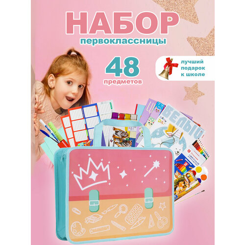 Набор первоклассника Отличник 48 предметов в папке для девочки - это базовый комплект товаров для ученика 1 класса, упакованный в яркую папку с ручкой. Набор составлен на основе советов учителей начальных классов и пожеланий родителей. Набор является традиционным подарком выпускнику детского сада. В состав набора Отличник входят только сертифицированные отечественные и импортные школьные принадлежности, соответствующие требованиям по безопасности детских товаров законодательства РФ. Состав: Тетрадь 12л. в клетку (зеленая обложка.) - 5шт. Тетрадь 12л. в косую линейку (зел. обложка) - 3шт. Обложка для тетрадей (прозрачная) - 5шт. Набор обложек для начальных классов - 12 шт. Бумага цветная односторонняя 8цв,16л. (ф. А4), Картон цветной мелован. 8цв, 8л. (ф. А4), Картон белый, 7л. (ф. А4), Краски акварельные 12 цв, Кисть для рисования Пони № 3, Пластилин 8 цв, Карандаши цветные заточенные, 12цв. , Клей-карандаш 8гр, Точилка пластиковая, Ножницы детские 12 см, Линейка с волнистым краем, пластиковая, 15 см, Ручка шариковая синяя - 2шт, Ручка Пиши-Стирай, синяя, Карандаш чернографитный НВ заточенный - 2 шт, Ластик - 2 шт, Расписания уроков, А4 - 2шт, Пенал-тубус пластиковый, Папка с ручками.