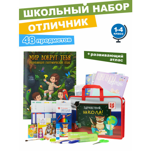 Набор первоклассника Отличник 48 предметов в папке - это базовый комплект товаров для ученика 1 класса, упакованный в яркую папку с ручкой. Набор составлен на основе советов учителей начальных классов и пожеланий родителей. Набор является традиционным подарком выпускнику детского сада. В состав набора Отличник входят только сертифицированные отечественные и импортные школьные принадлежности, соответствующие требованиям по безопасности детских товаров законодательства РФ. Состав: Тетрадь 12л. в клетку (зеленая обложка.) - 5шт. Тетрадь 12л. в косую линейку (зел. обложка) - 3шт. Обложка для тетрадей (прозрачная) - 5шт. Набор обложек для начальных классов (прозрачные) - 12шт. Бумага цветная односторонняя 8цв,16л. (ф. А4) , Картон цветной мелован. 8цв, 8л. (ф. А4), Картон белый, 7л. (ф. А4), Краски акварельные 12 цв, Кисть для рисования Пони № 3, Пластилин 8 цв, Карандаши цветные заточенные, 12цв. , Клей-карандаш 8гр, Ластик "NEON"30x13x7 мм. - 2 шт. Точилка пластиковая, Ножницы детские 12 см, Линейка 15см, пластиковая, с волнистым краем, Ручка пиши-стирай, гелевая, синяя, 0.5 мм. Ручка шариковая 0.7мм, прозрачный корпус с каучуковым держателем - 2шт. Карандаш чернографитный НВ - 3 шт. Расписания уроков, А4 - 2шт, Пенал-тубус, Папка с ручками. Как заинтересовать малыша географией? Конечно, в игровой форме. Например, предложить ему отправиться в путешествие! И не в одиночку, а в отличной компании. Знакомьтесь: это умница Ариша, ее любознательные братья Тема и Митя, их верный пес Астор и любимая кошка Ириска. Вместе с ребятами юный читатель побывает в загадочном космосе, облетит нашу удивительную планету и даже заглянет в прошлое. Маленький путешественник узнает много интересного из мира географии, а еще сам разгадает запутанные головоломки и проведет настоящие научные эксперименты! В красочном атласе в доступной форме изложены знания о солнечной системе и исследованиях космоса, зарождении жизни на Земле, строении нашей планеты и ее рельефе, погоде и климате, животных и растениях, и политическом устройстве мира. На страницах атласа вы найдете интересные задания и идеи для опытов, которые можно провести дома. Пособие разработано для детей дошкольного и младшего школьного возраста.