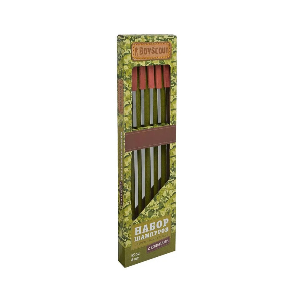 Купить Набор плоских шампуров Boyscout, 55 см, с деревянными ручками с кольцами, в упаковке 6 штук с доставкой по всей России.