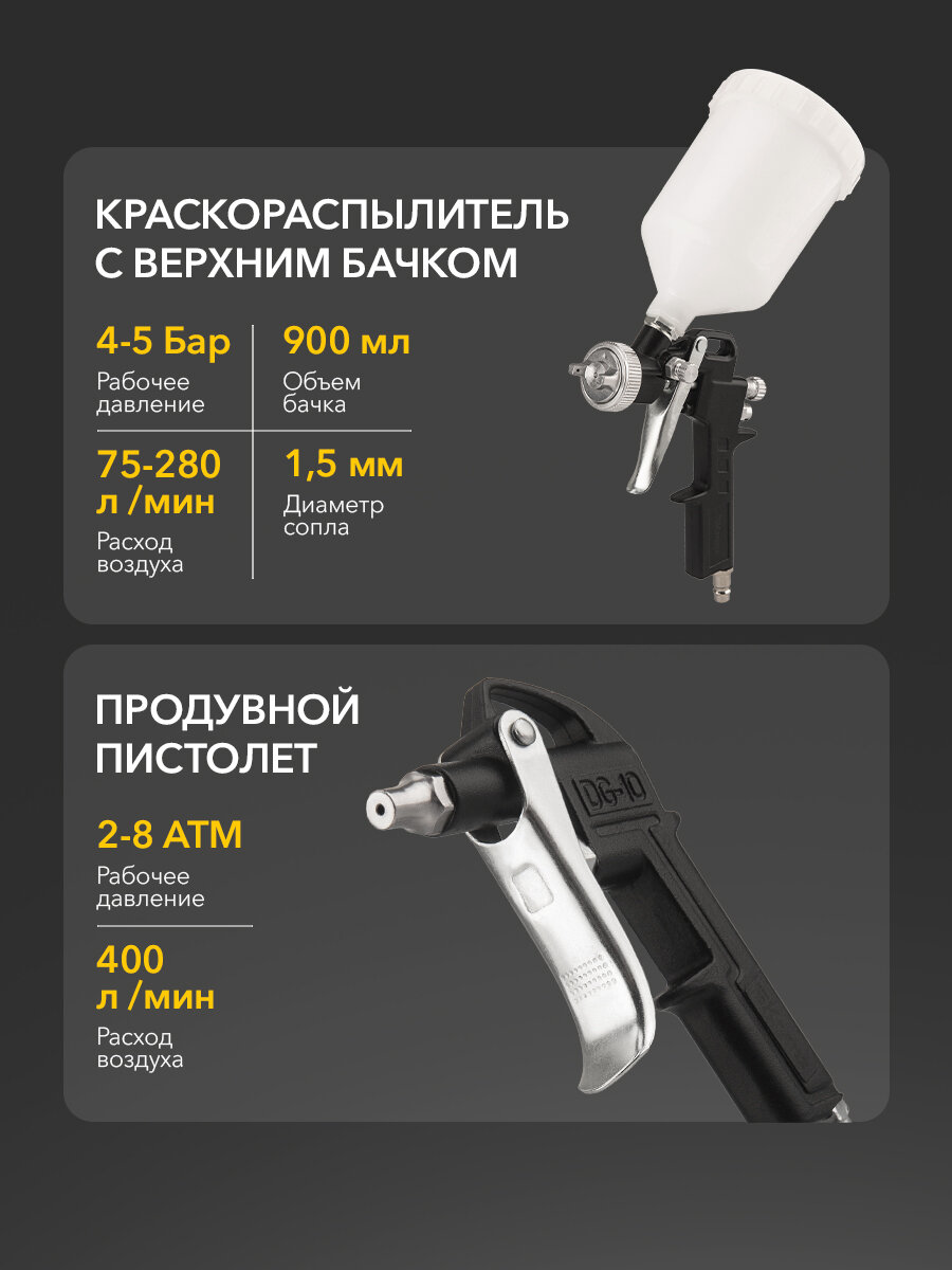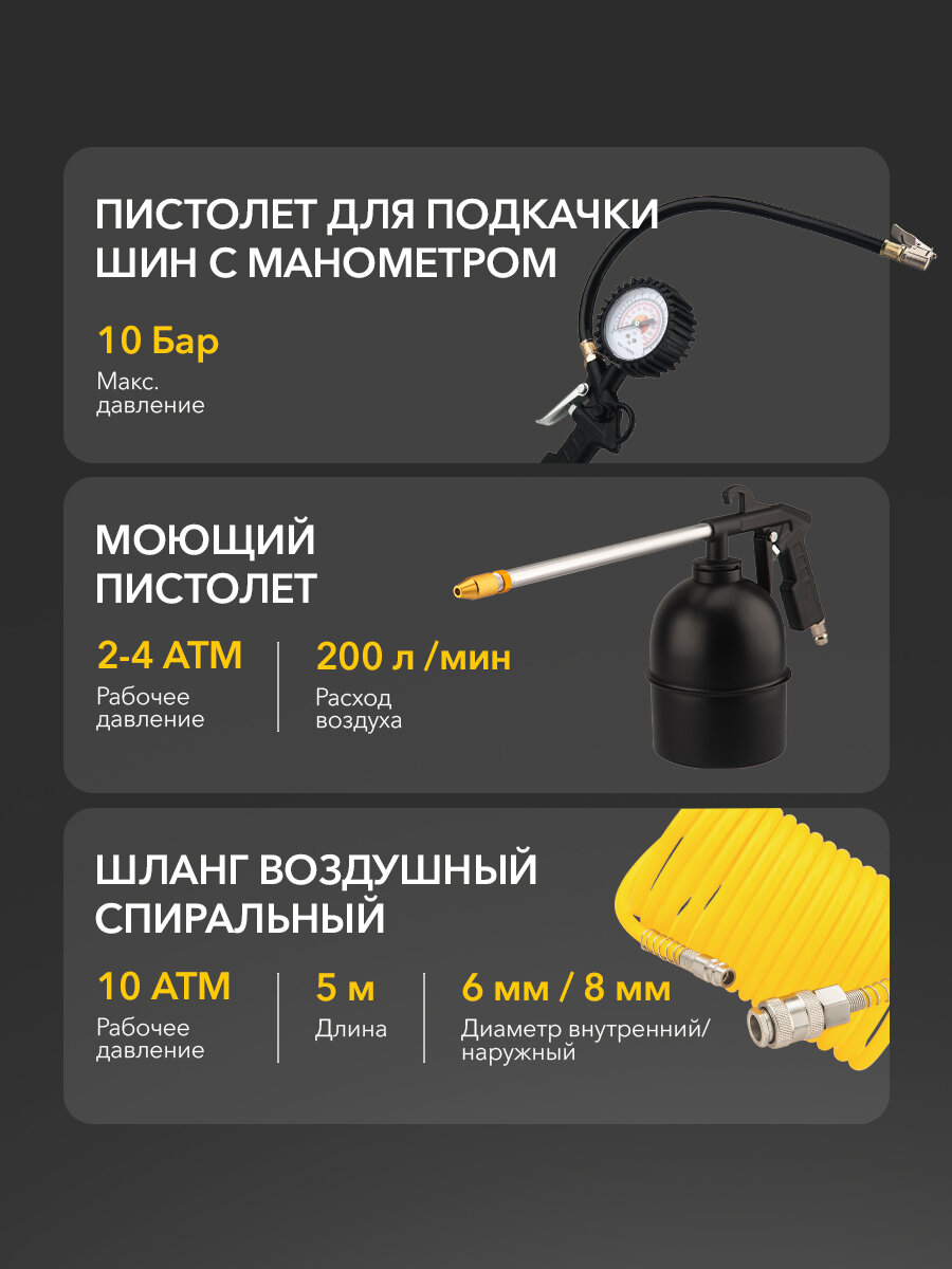 Набор подходит для гаража, автомастерской, строительства и ремонта в доме или квартире. Совместим со всеми типами компрессоров.