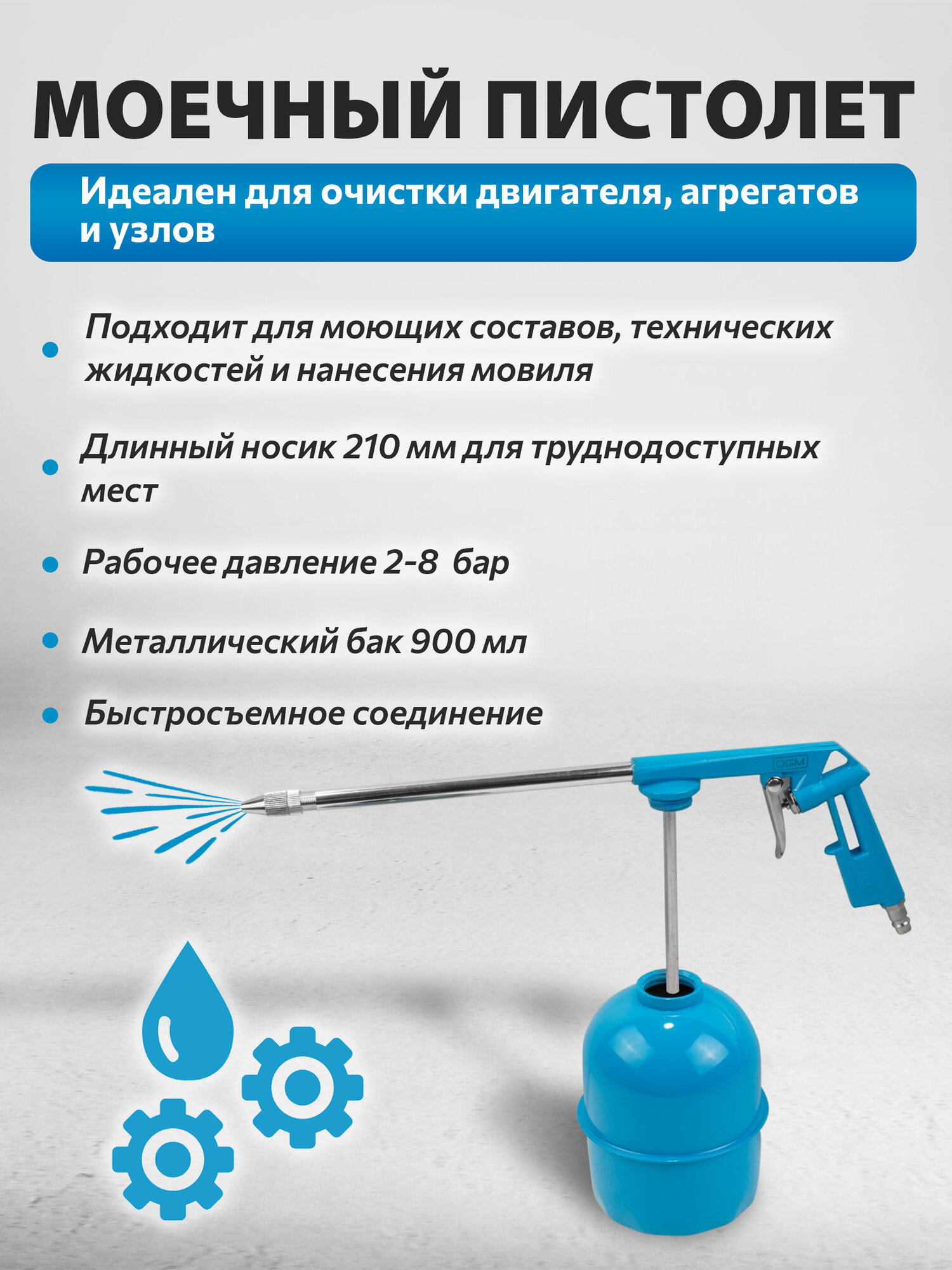 Набор пневмоинструмента DGM S510 5 предметов (DG4018-2) - это комплект из пяти инструментов, предназначенных для работы с компрессором. В набор входят: - Краскораспылитель HVLP; - Металлический бачок краскораспылителя; - Пистолет моечный; - Пистолет для подкачки шин с манометром; - Пистолет продувочный; - Шланг спиральный; Краскопульт пневматический HVLP с нижним металлическим бачком обеспечивает равномерное нанесение краски на поверхность. Сопло краскораспылителя имеет диаметр 1.8 мм, а объем бачка составляет 750 мл. Краскораспылитель обладает рабочим давлением 3.0 бара и потреблением воздуха - 230 л/мин. Пистолет моечный пневматический предназначен для мойки поверхностей моющими составами. Он оснащен резьбовым соединением и диаметром воздушного штуцера 1/4 дюйма. Пистолет для подкачки шин пневматический с манометром позволяет контролировать давление в шинах. Максимальное давление составляет 3.0 бара, а минимальный расход воздуха - 230 л/мин. Продувочный пневматический пистолет используется для очистки поверхностей от пыли и сухой грязи. Он оснащен спиральным шлангом длиной 5 метров и внутренним диаметром 6 мм. Шланг спиральный обеспечивает удобное подключение аксессуаров к компрессору. Его диаметр составляет 6/8 мм, а максимальное давление - 3.0 бара. В комплекте с набором пневмоинструмента вы получаете руководство по эксплуатации, что упрощает процесс использования и обслуживания инструментов. Набор пневмоинструмента DGM S510 5 предметов (DG4018-2) станет незаменимым помощником для тех, кто занимается ремонтом автомобилей, покраской или мойкой.