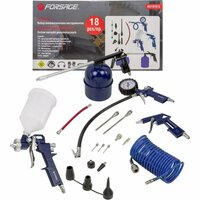 Набор от бренда FORSAGE включает 18 предметов, необходимых для точного нанесения покрытий, очистки, подкачки шин и мойки автомобильных узлов. Он обеспечивает высокую производительность и надёжность при использовании с компрессорами. Состав набора: Краскопульт: равномерное распыление краски, нанесение тонкого слоя, точность и контроль — идеально для финишной отделки. Пневмопистолет обдувочный: две насадки (110 и 140 мм) — выбор оптимального воздушного потока для удаления пыли и мусора. Пистолет для подкачки шин с манометром: диапазон давления 0–16 бар, гибкий шланг и переходники — удобно даже в труднодоступных местах. Пневмопистолет для мойки двигателя: металлический бачок 850 мл и сопло 3 мм — эффективно удаляет загрязнения, масло и пыль. Дополнительные преимущества: Профессиональный уровень: подходит для СТО, гаража и домашнего ремонта. Надёжные материалы: металлические элементы и гибкий шланг рассчитаны на долгую эксплуатацию. Удобство использования: длина шланга 5 м — комфорт при работе на расстоянии от компрессора. Экономия времени: все необходимые инструменты собраны в одном наборе.