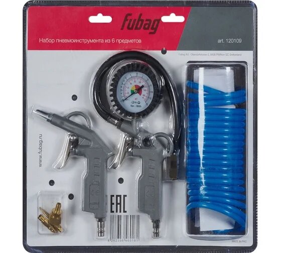 Набор пневмоинструмента FUBAG 6 предметов, пистолет для накачки с манометром, продувочный пистолет, спиральный шланг 5 м, насадки для накачки 3 шт. 120109: сравнение цен, характеристики, фото, актуальное наличие и цены.