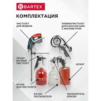 Набор Bartex – это отличный комплект, в котором есть все необходимое для работы с пневматикой. Он значительно сократит время ремонтных работ и улучшит их качество. С его помощью Вы без труда нанесете ровное лакокрасочное покрытие, подкачаете шины или избавитесь от нежелательного мусора в труднодоступных местах. Это не только нужный в каждом доме инструмент, но и отличная идея для подарка.