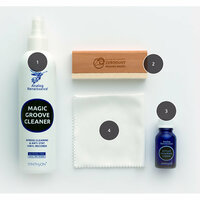 Спрей для чистки пластинок (250 мл), жидкость для очистки иглы звукоснимателя, щетка из шерсти мериноса, салфетка из микрофибры.