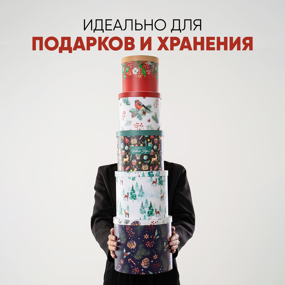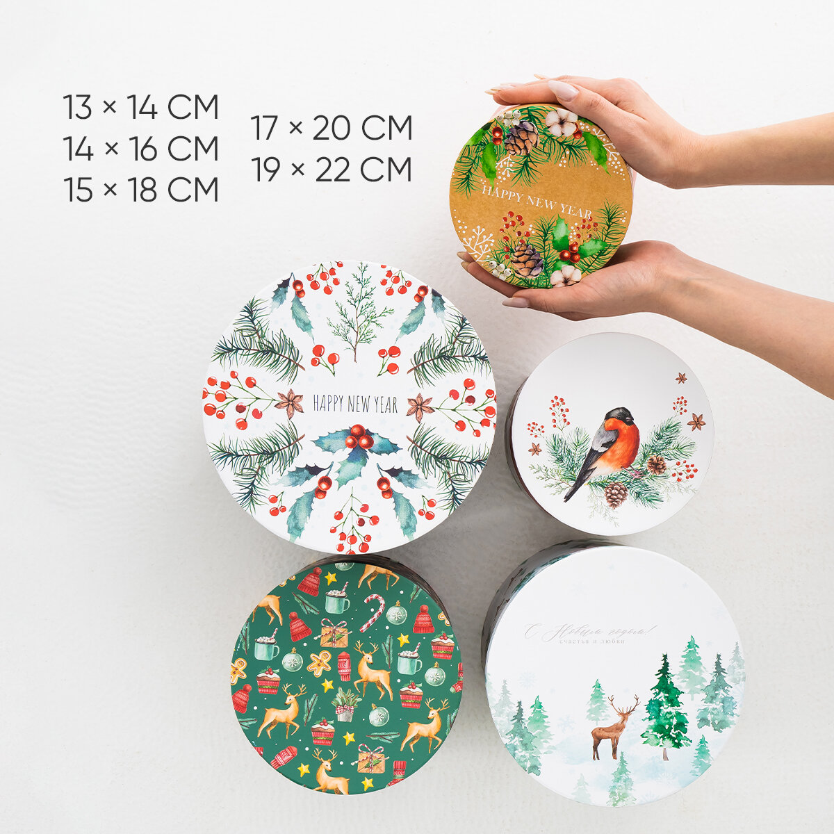 Каждая круглая коробка из набора украшена стильным дизайном и фирменными принтами новогодних атрибутов, что придает ей особую праздничную атмосферу. Это универсальное и оригинальное решение для упаковки подарков как для женщин, так и для мужчин: они подойдут маме, дочке, сестре, подруге, коллеге, любимой, бабушке, а также мужчине, будь то папа, дедушка, брат, муж или друг. Даже для детей и малышей эти коробки станут отличным выбором. Он прекрасно подойдёт как для семейных праздников, так и для корпоративных мероприятий, а яркий дизайн привлечёт внимание и создаст праздничное настроение.