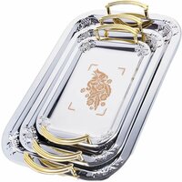 Набор из трех сервировочных подносов разного размера, изготовленных из нержавеющей стали с зеркальной полировкой, станет незаменимым предметом для сервировки стола. Они имеют прямоугольную форму и оформлены декоративными элементами и ручками золотистого цвета. Подносы отлично подойдут для подачи рыбных блюд, а традиционные блюда будут выглядеть на них более аппетитно. Благодаря оригинальному дизайну сервировочные подносы придадут элегантный вид любому обеденному столу. Современный стильный дизайн и функциональность позволят подносам занять достойное место на Вашей кухне.