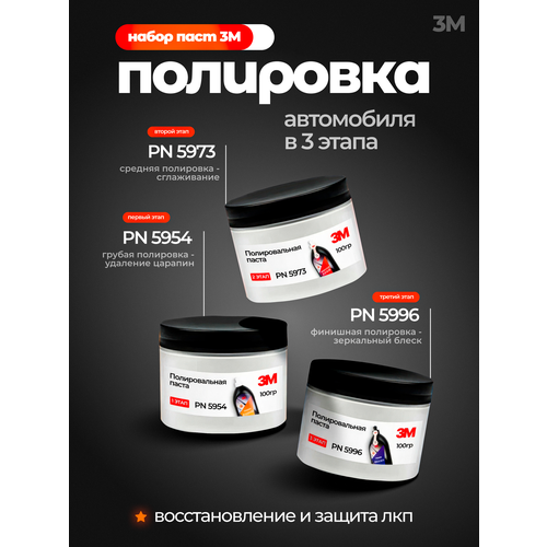Набор полировальных паст для кузова 3M: Восстановите блеск вашего автомобиля! Этот набор полировальных паст 3M включает в себя три высокоэффективные пасты (5954, 5973 и 5996), предназначенные для комплексной полировки и восстановления лакокрасочного покрытия автомобиля. Отлично подходит для удаления царапин, потертостей, голограмм и других дефектов, возвращая кузову первозданный блеск и глубину цвета.