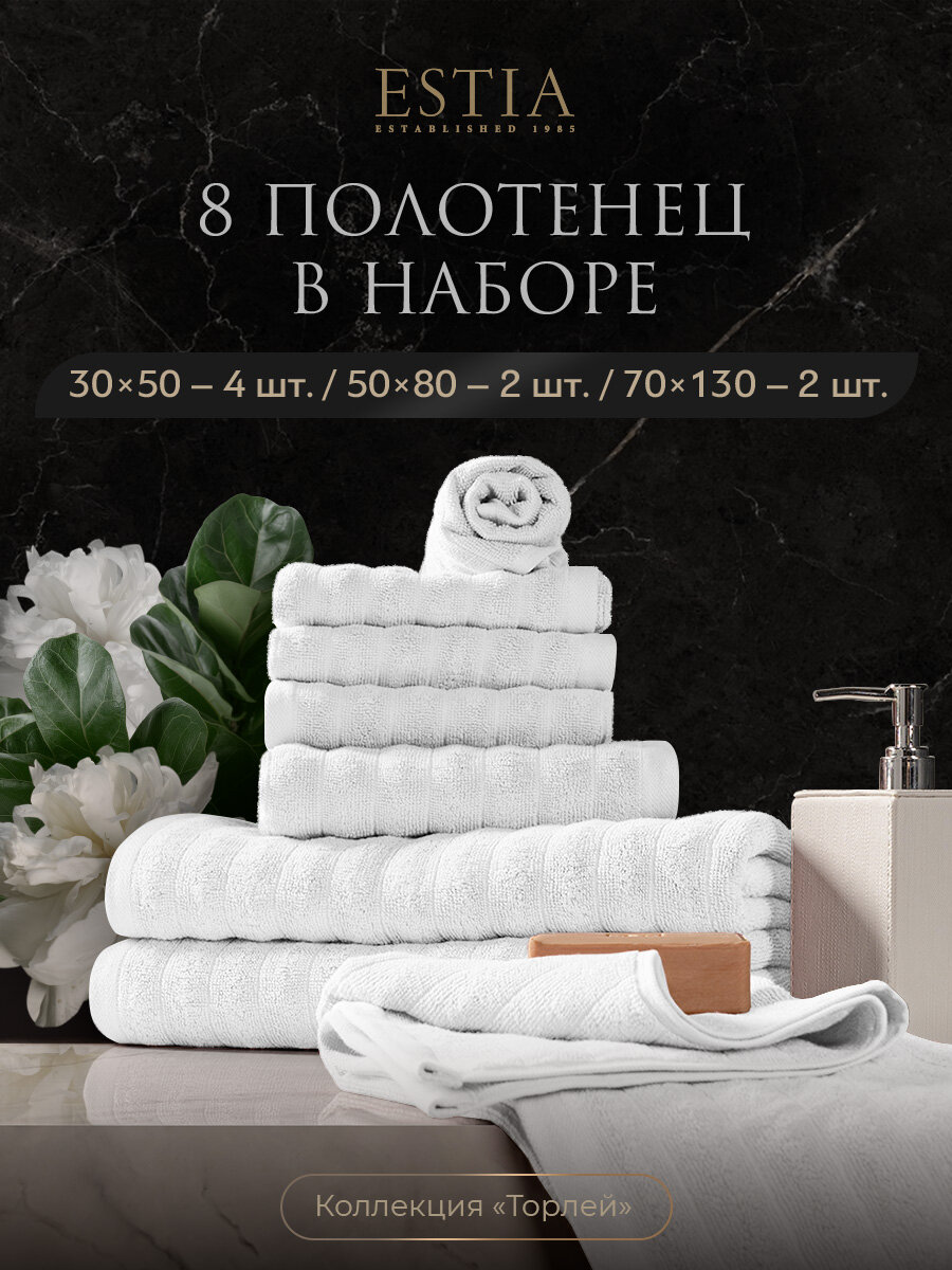 Estia «Торлей» комплект полотенец 30х50-4/50х80-2/70х130-2 хлопок, белый, 500 г/м2, 8-пр.: сравнение цен, характеристики, фото, актуальное наличие и цены.