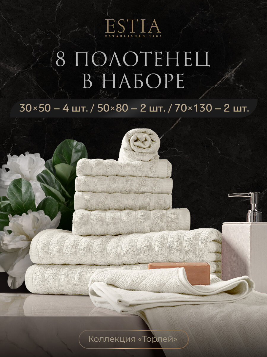 Купить Estia «Торлей» комплект полотенец 30х50-4/50х80-2/70х130-2 хлопок, экрю, 500 г/м2, 8-пр. с доставкой по всей России.