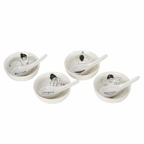 Набор Undressed из четырех пиал из фарфора белого цвета с оригинальными рисунками. В комплект так же входят четыре ложки.