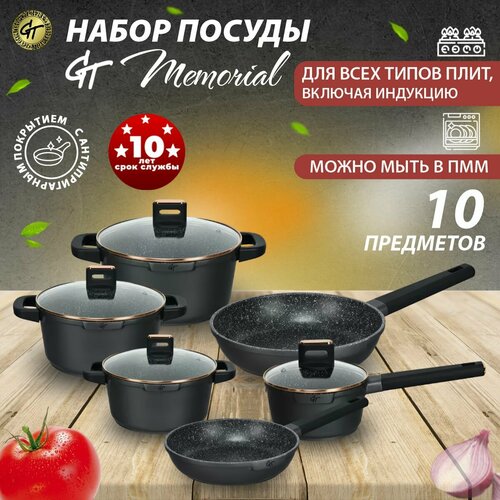 Премиальный набор посуды для приготовления "GT Memorial" (кастрюля с толстым дном с крышкой - 3 шт, сковорода с крышкой - 1 шт.) станет вашим любимым на кухне. Набор подходит для использования на всех видах плит, в том числе и на индукции (индукционной) и на газовой плите. Толщина стенок у всей посуды 6 мм. Толщина дна 8 мм. В набор посуды входит 10 предметов: кастрюля с крышкой V-2,5 л, D верха 20 см; кастрюля с крышкой V-4.3 л, D верха 24 см; кастрюля с крышкой V-6,5 D верха 28 см; ковш с крышкой V-1,4 л, D верха ковша 16 см; сковорода D верха 24 см; сковорода D верха 28 см. Можно мыть в посудомоечной машине.